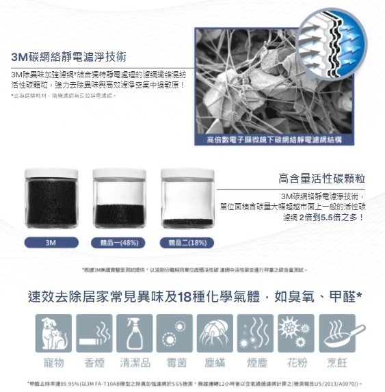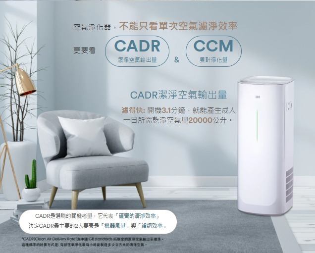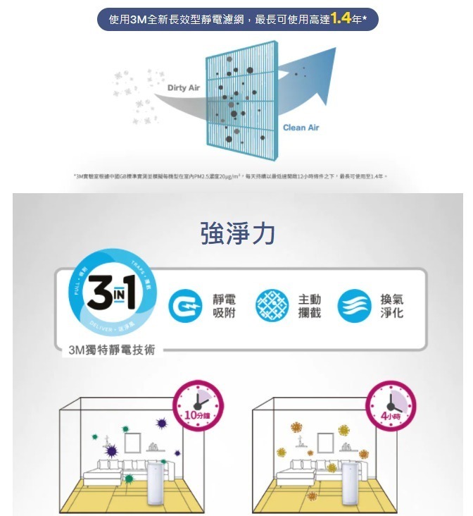CADR潔淨風量值450 CMH,適用581平方英尺空間(依每小時循環全室空氣2.5次至6次計算),10分鐘即有效濾淨99.9%空氣中總生菌數和99.9% PM2.5,開機不到3.1分鐘,即可產出成人一天所需乾淨空氣量20000公升,快速淨化居家空氣。 全球逾200項靜電濾淨技術專利,以3M發明的不織布核心技術,與多項技術平台交錯運用,於超細濾網纖維施加正負電荷,最高能濾除空氣中99.9%如塵埃、花粉、塵螨、寵物毛屑等過敏原與帶菌微粒, 甚至能過濾小至比PM2.5微米還小800倍的0.003微米微粒。
