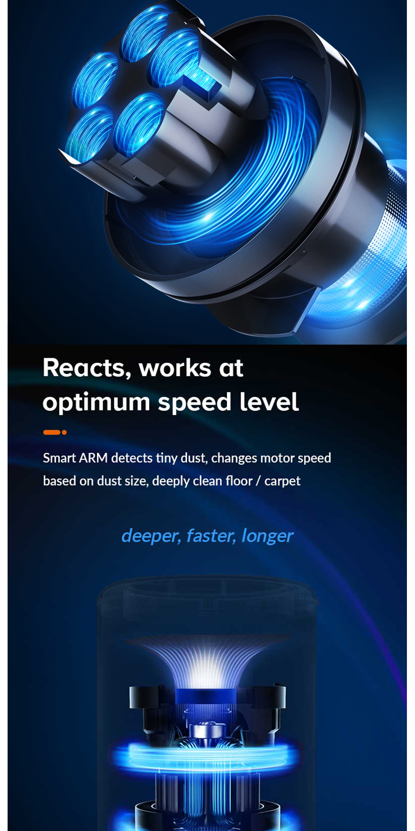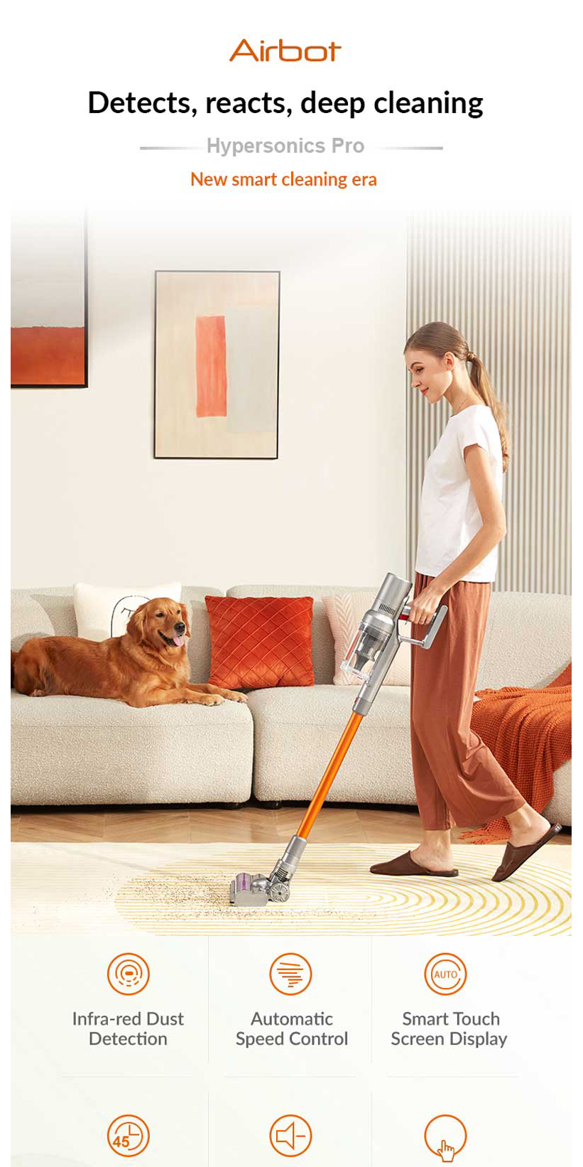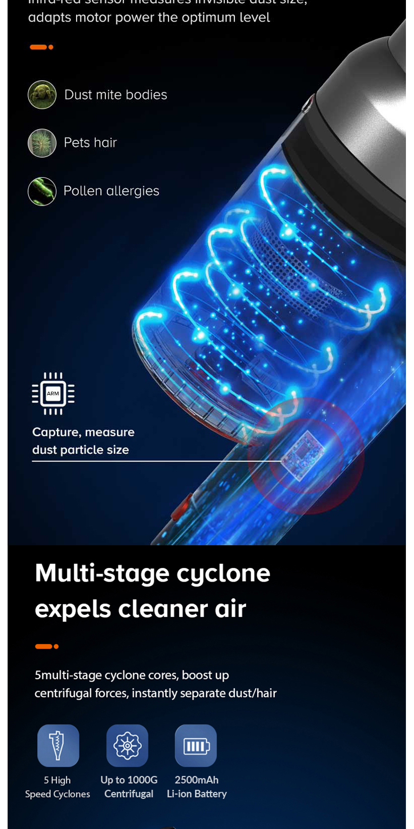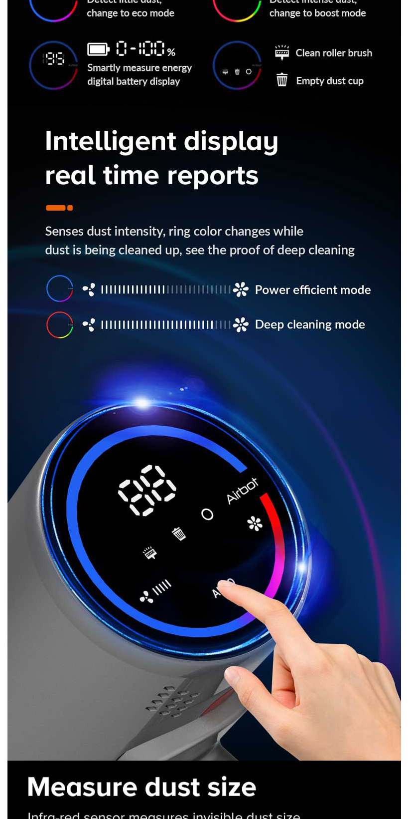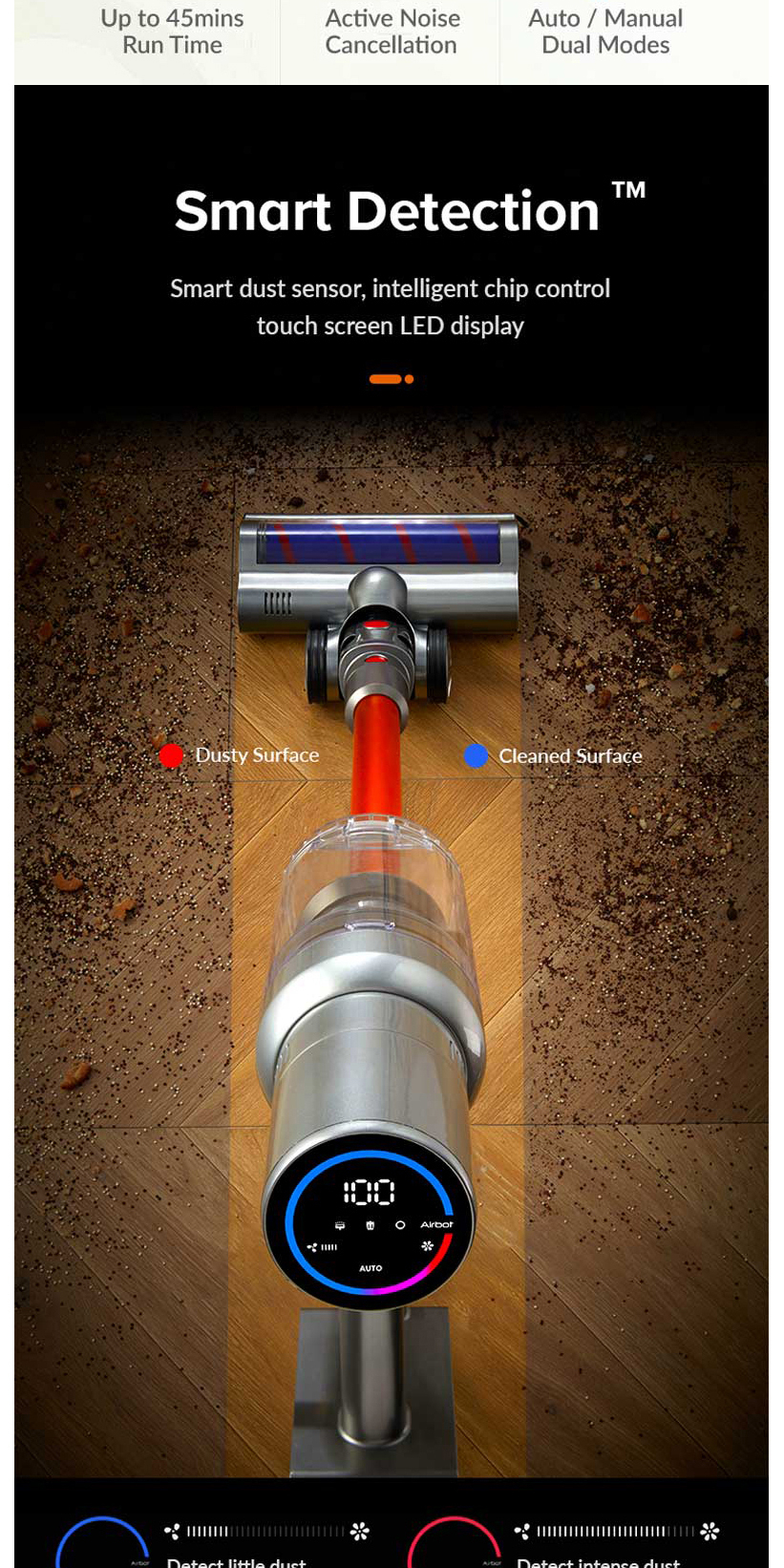Airbot Hypersonics Pro 無線手提吸塵機 專業版 27000Pa自動感應灰塵密度並智能調節功率以實現電池壽命和電機功率之間的最佳平衡的無線吸塵器。這使用戶無需頻繁更換真空模式即可進行清潔。