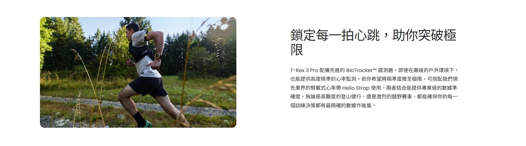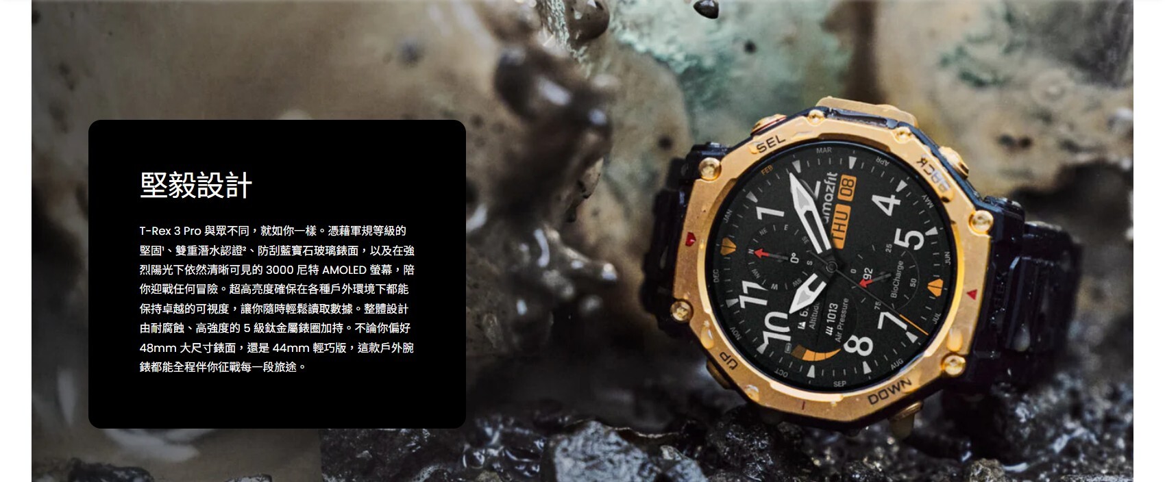 無論你是在崎嶇的山徑上挑戰極限、潛入水底世界,還是為下一場大型比賽備戰,T-Rex 3 Pro 都專為不妥協的訓練者而生。以堅韌、高級的材質打造,並配備先進功能,它能承受最嚴峻的環境,同時提供精準的追蹤與表現洞察。全天候的舒適佩戴感及卓越的電池續航,讓你時刻緊扣目標,掌握每一刻 —— 無論冒險帶你去到哪裡。