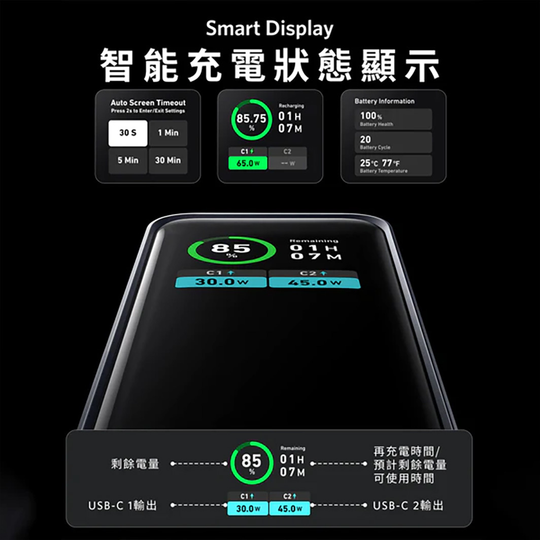 最大65W USB-C PD3.0快充技術可快速為設備充電,配置兩個USB-C輸出口,讓你能同時為兩部裝置提供快速充電。