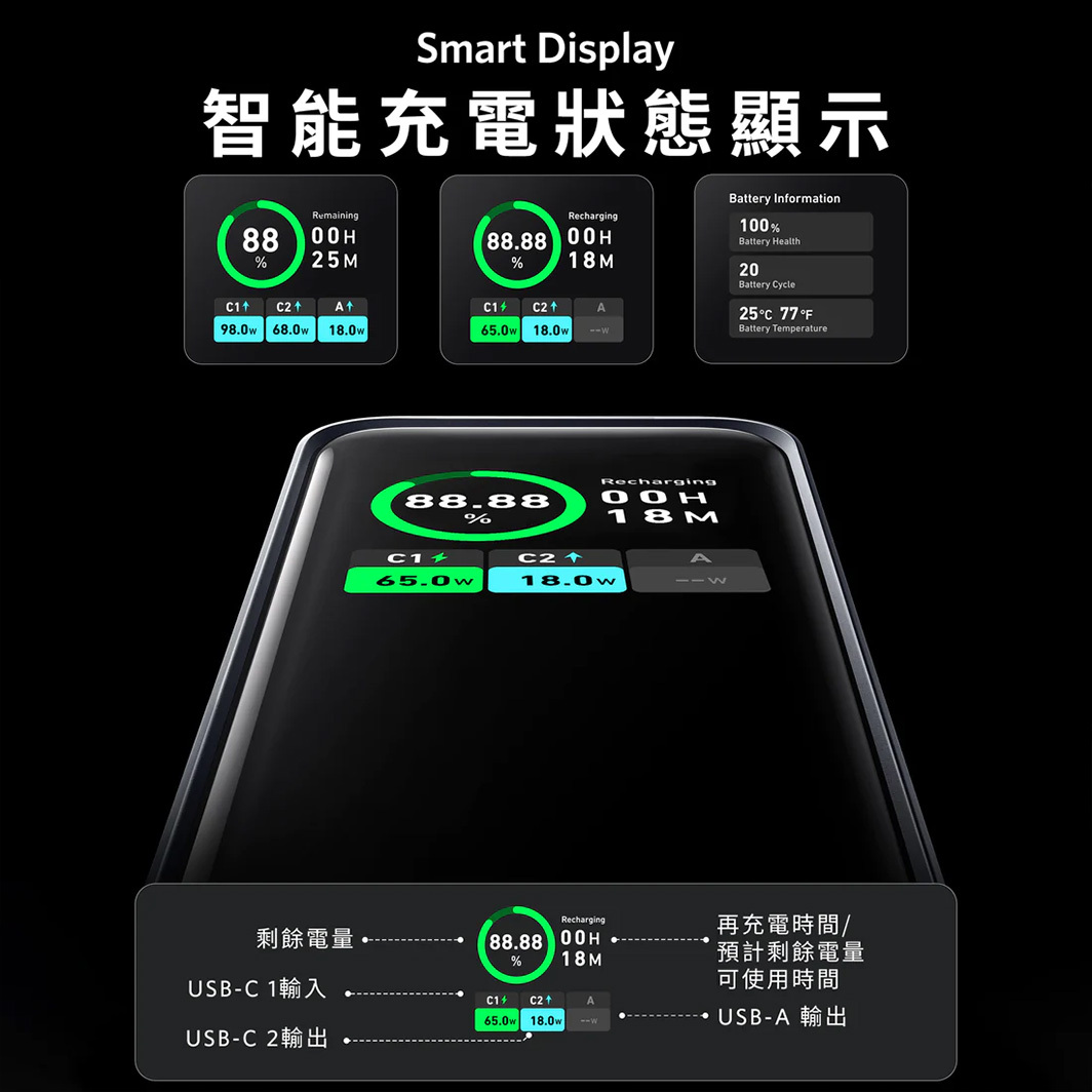 搭載TFT彩色顯示屏及清晰易懂的UI設計,讓您隨時瞭解充電資訊,如剩餘電量和輸入輸出情況,使用更加便利另外搭載ActiveShield2.0智能控溫技術,自動偵測溫度並在需要時降溫,確保充電安全,為您的行動生活提供無限便利。