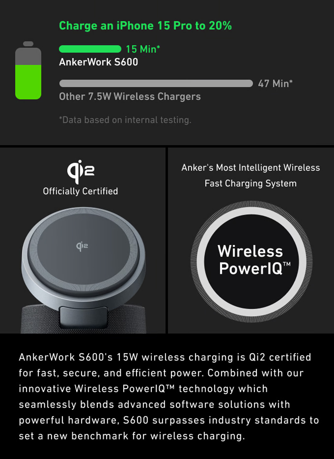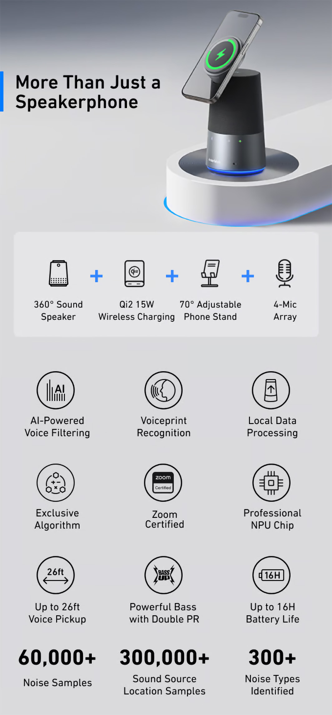 AnkerWork S600 是一款結合了無線充電的多合一喇叭,給您帶來無與倫比的聆聽和通話體驗。