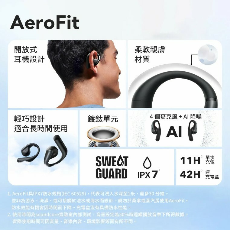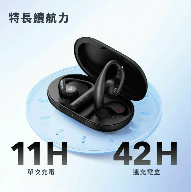 Anker SoundCore AeroFit 開放式運動真無線藍牙耳機,結合了14mm鍍鈦單元音質、鈦合金線材耳掛加強舒適性和IPX7防水功能,是您日常使用和運動時的理想選擇。