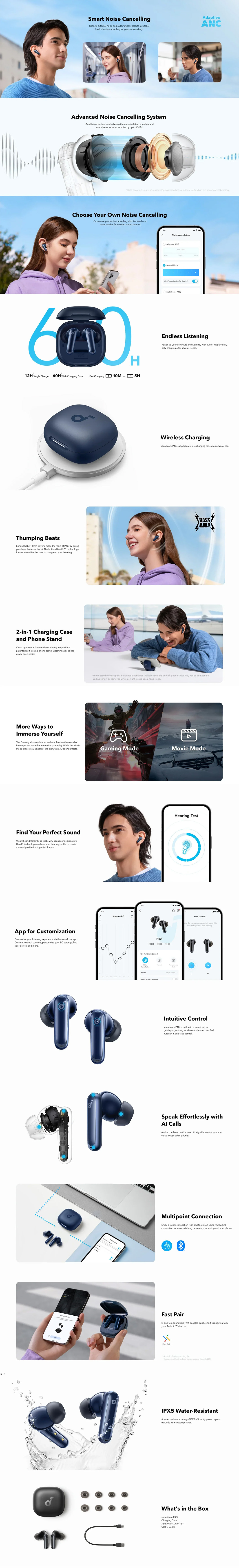 Anker Soundcore (A3955) P40i ANC 真無線藍牙耳機結合了先進環境主動降噪及11mm單體及BassUp技術和6個麥克風及AI演算法功能與60 小時的使用時間,為您帶來高品質的音樂和通話體驗。