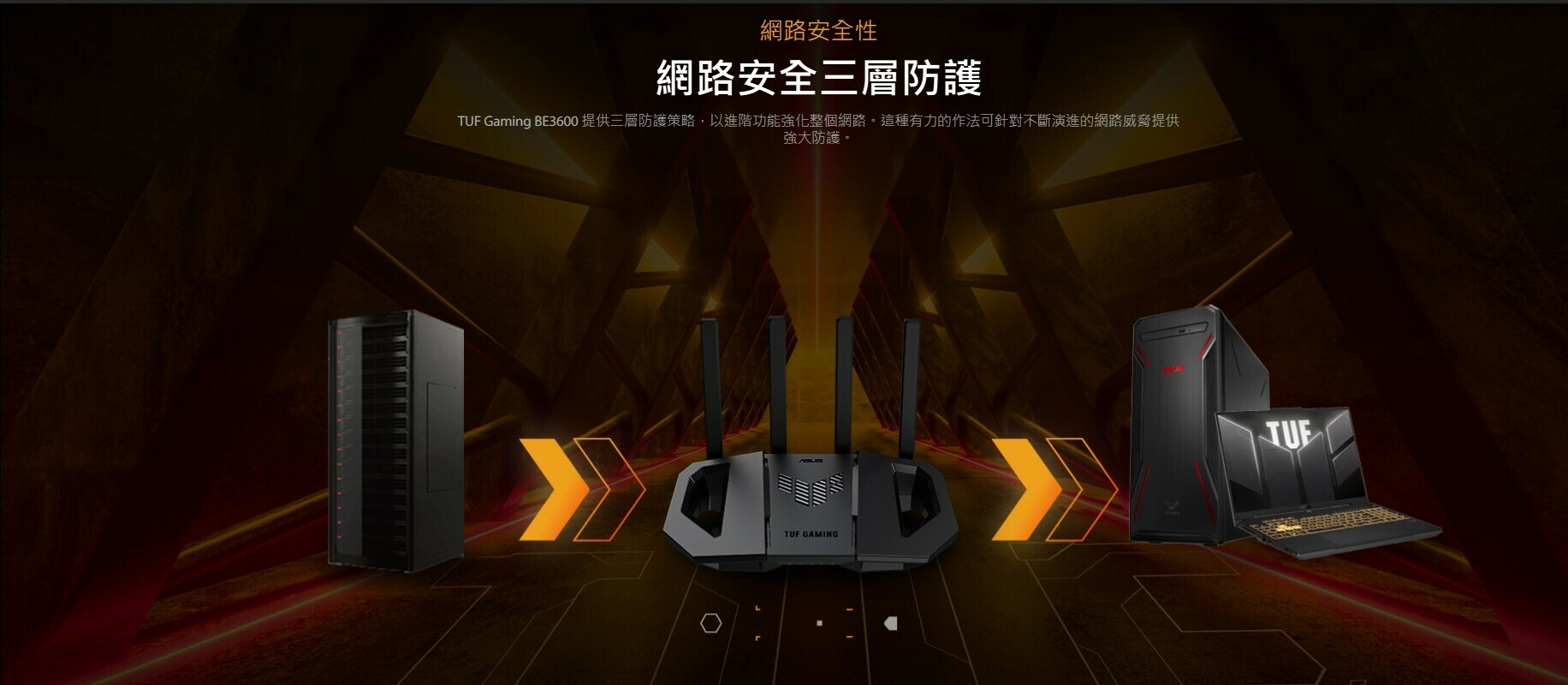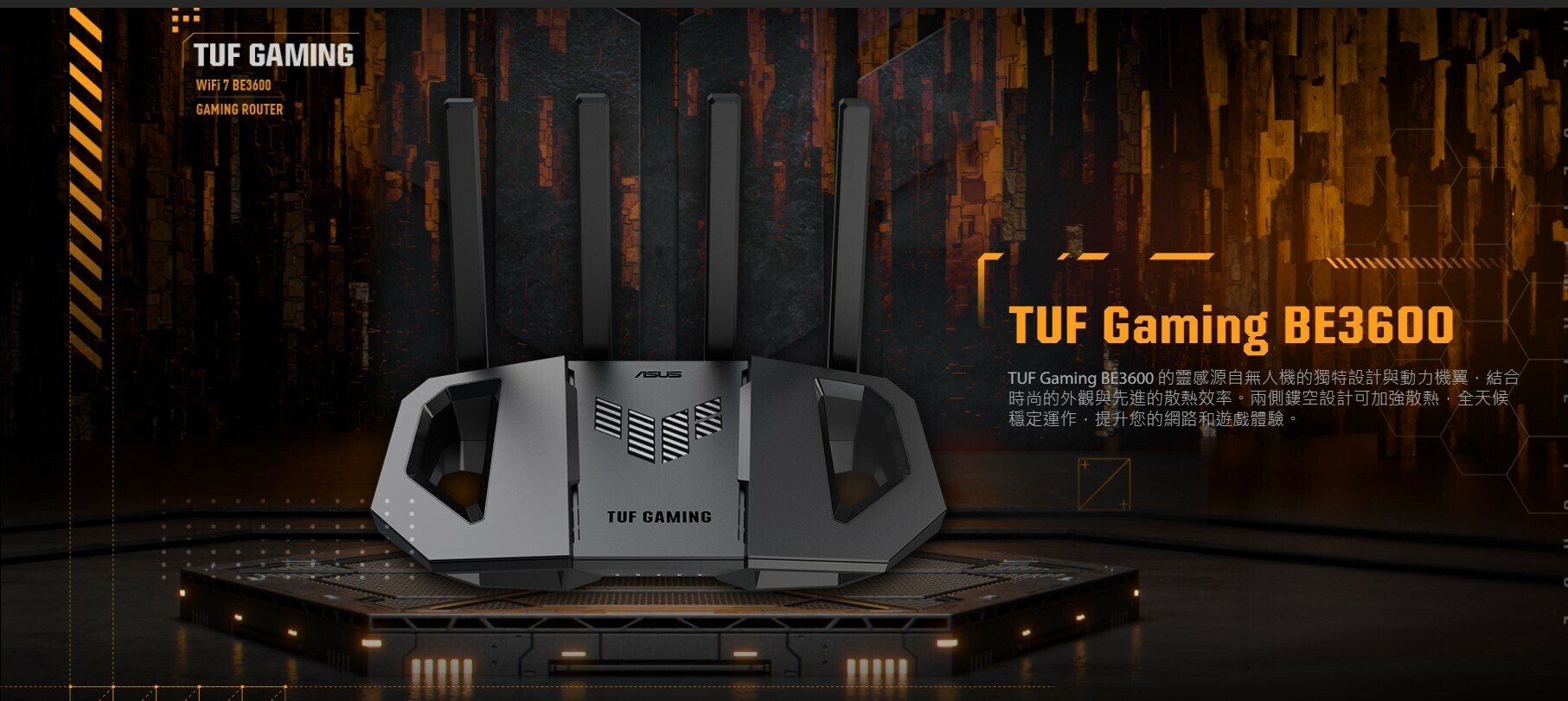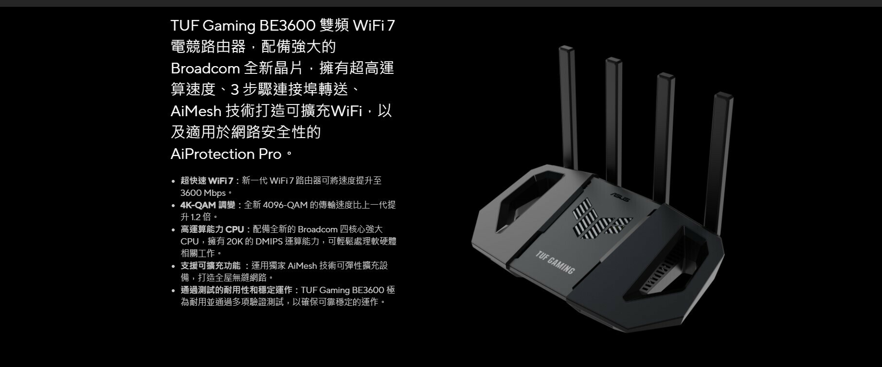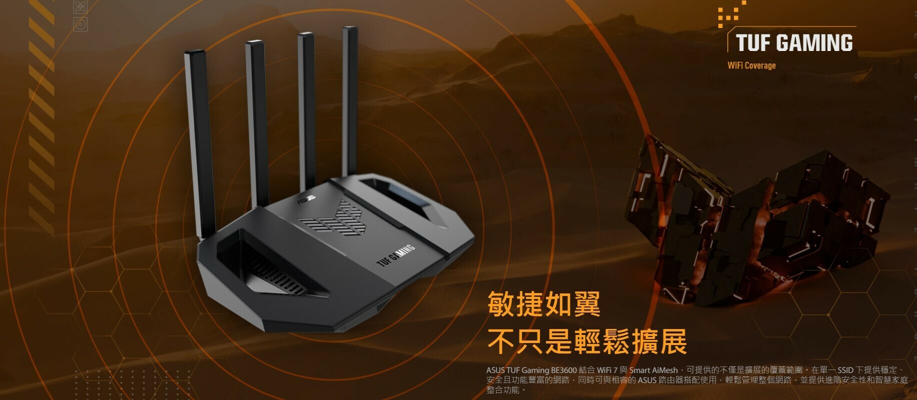 ASUS TUF Gaming BE3600 雙頻 WiFi 7 電競路由器,配備強大的 Broadcom 全新晶片,擁有超高運算速度、3 步驟連接埠轉送、AiMesh 技術打造可擴充WiFi,以及適用於網路安全性的 AiProtection Pro。