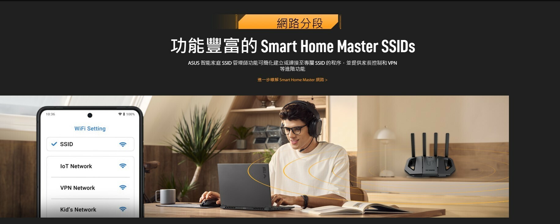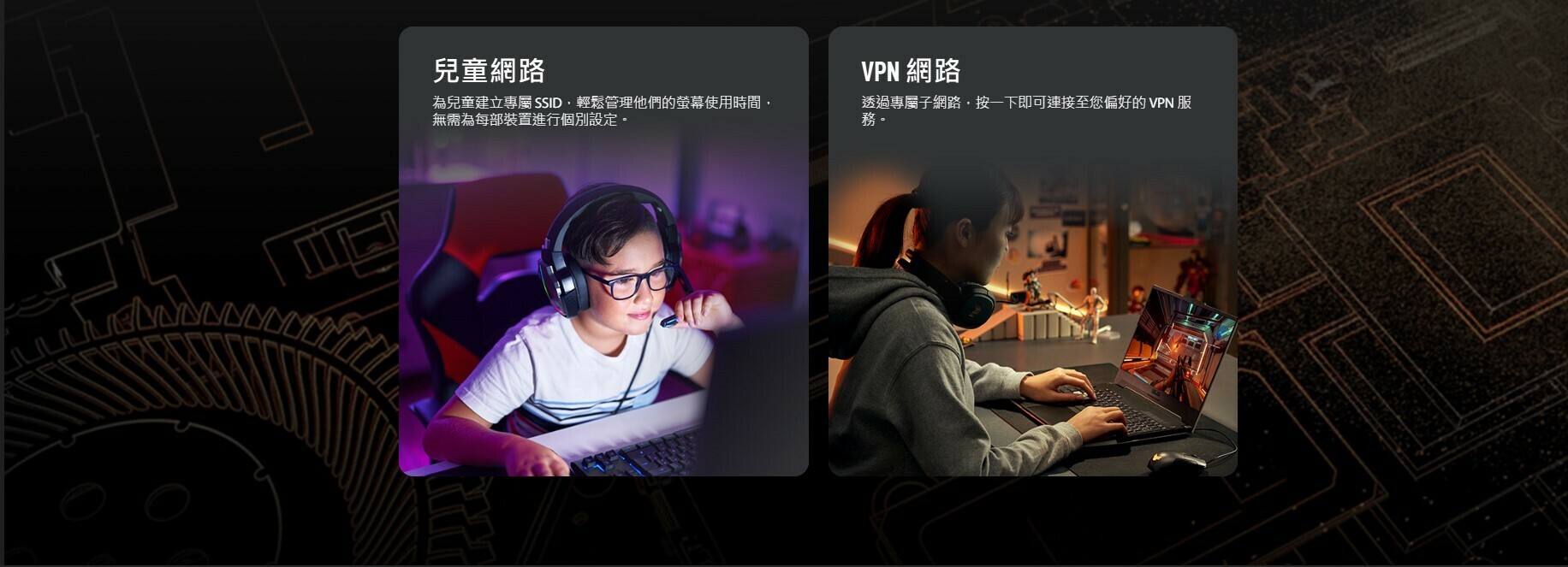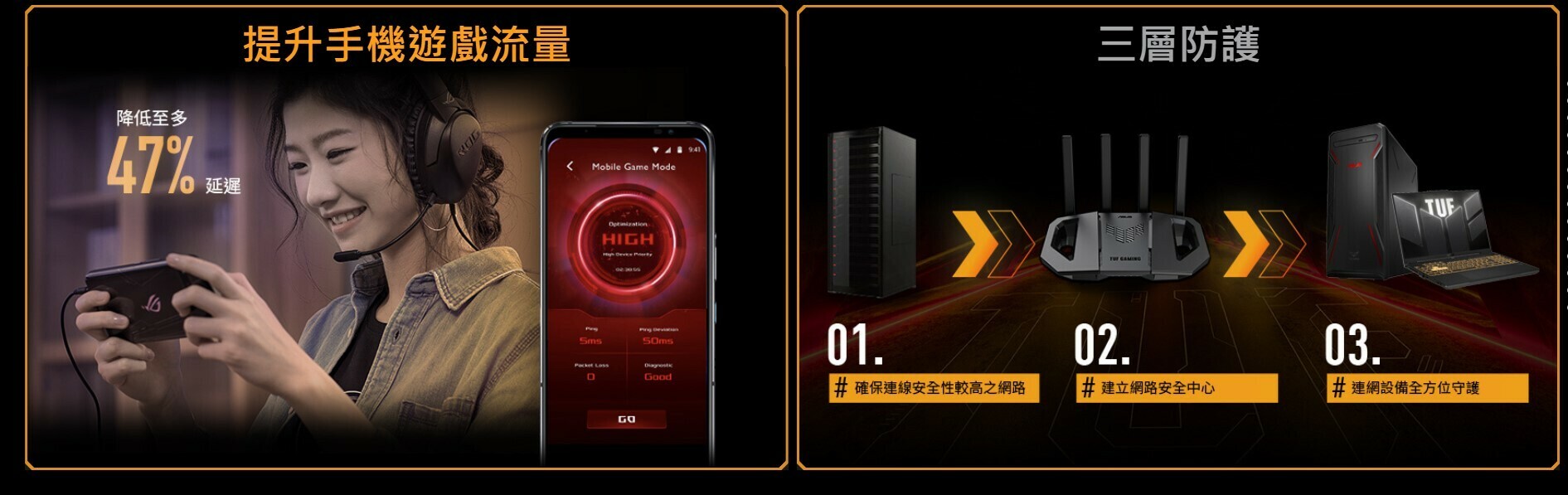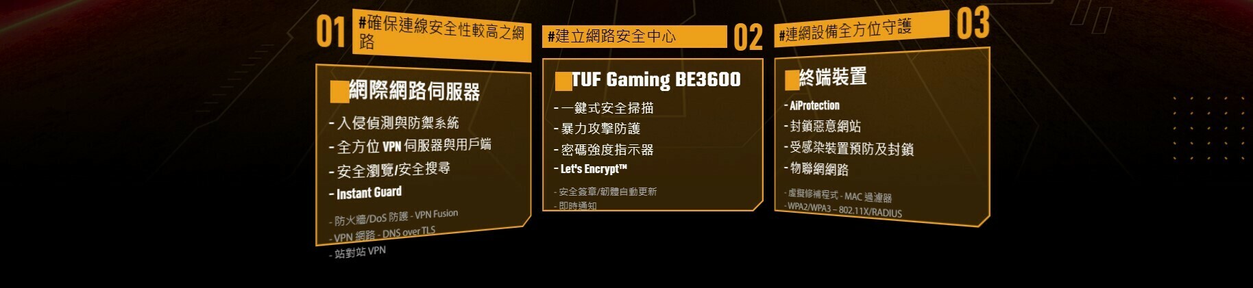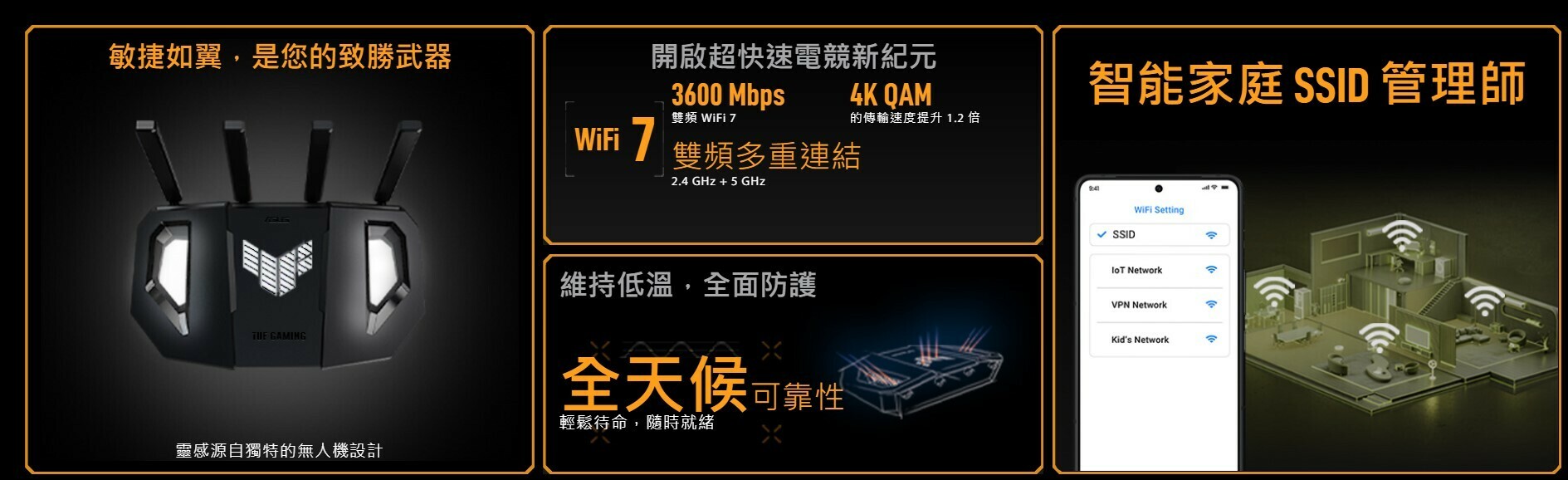 ASUS TUF Gaming BE3600 雙頻 WiFi 7 電競路由器,配備強大的 Broadcom 全新晶片,擁有超高運算速度、3 步驟連接埠轉送、AiMesh 技術打造可擴充WiFi,以及適用於網路安全性的 AiProtection Pro。