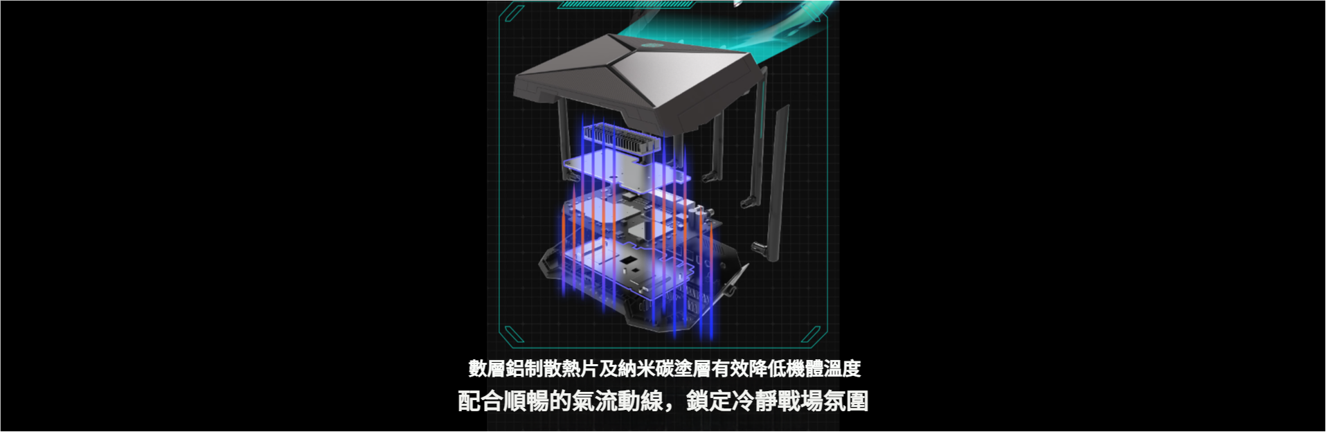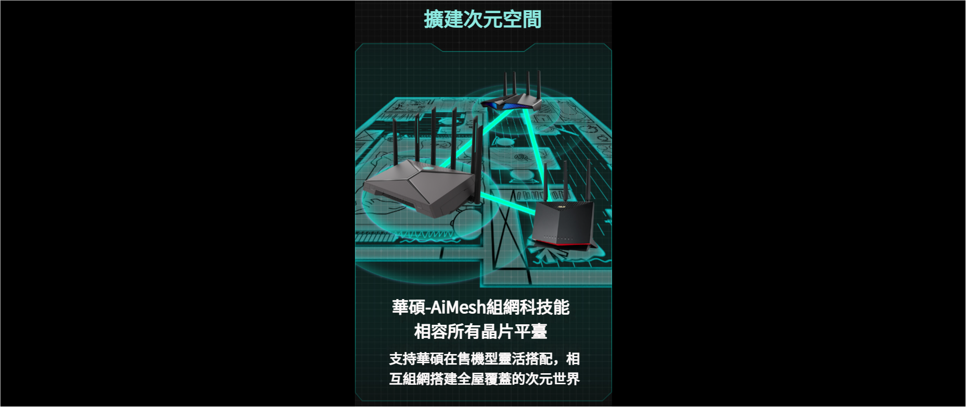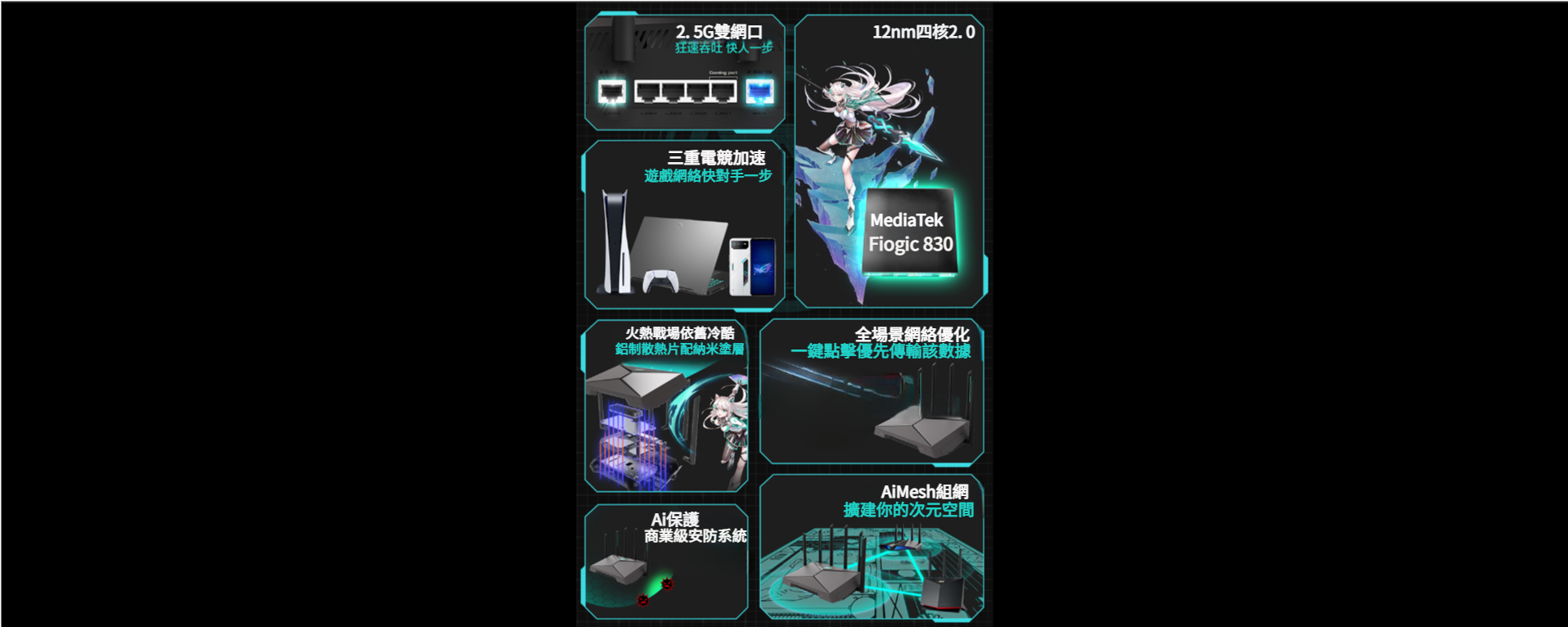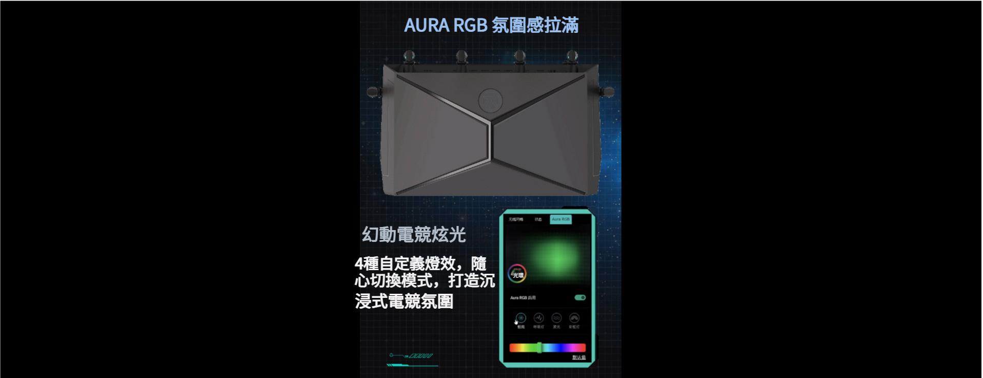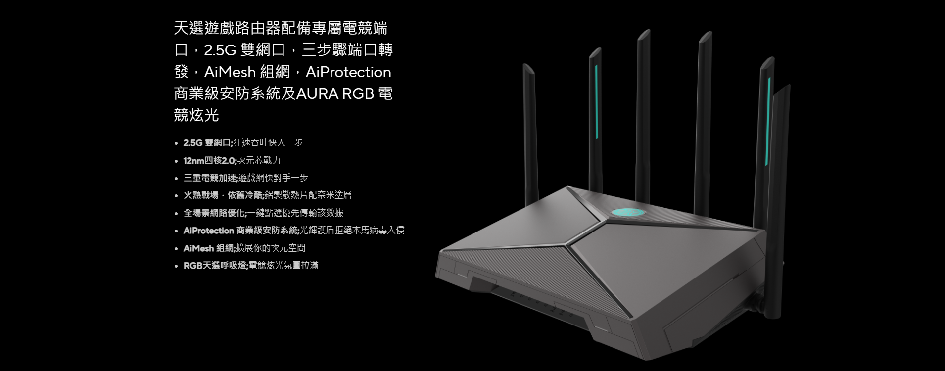天選遊戲路由器配備專屬電競端口,2.5G 雙網口,三步端口轉發,AiMesh 組網,AiProtection 商業級安防系統及AURA RGB 電競炫光