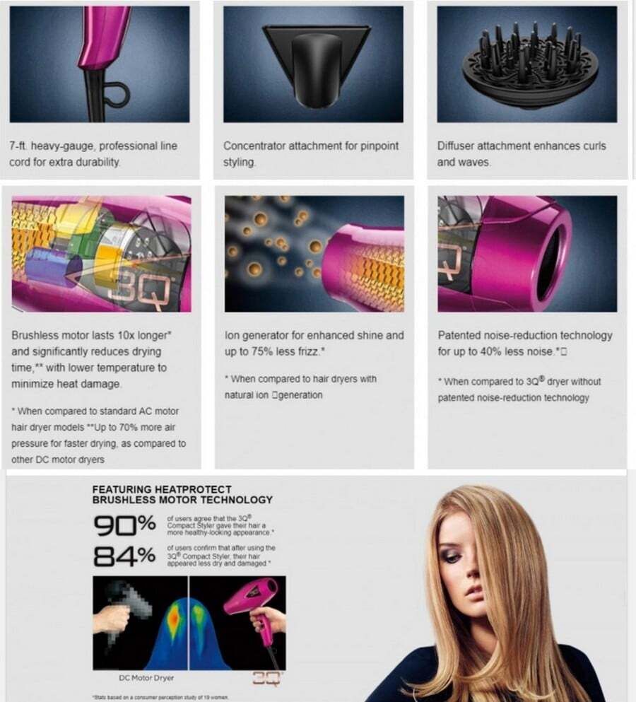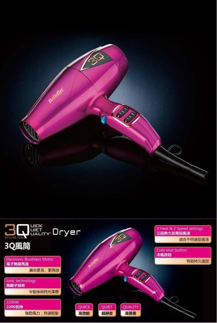 Babyliss 3QMSH 3Q 負離子風筒 採用 電子無刷馬達,壽命更長、更高效。Babyliss 3QMSH 風筒 設有 負離子技術 及 2200瓦特。