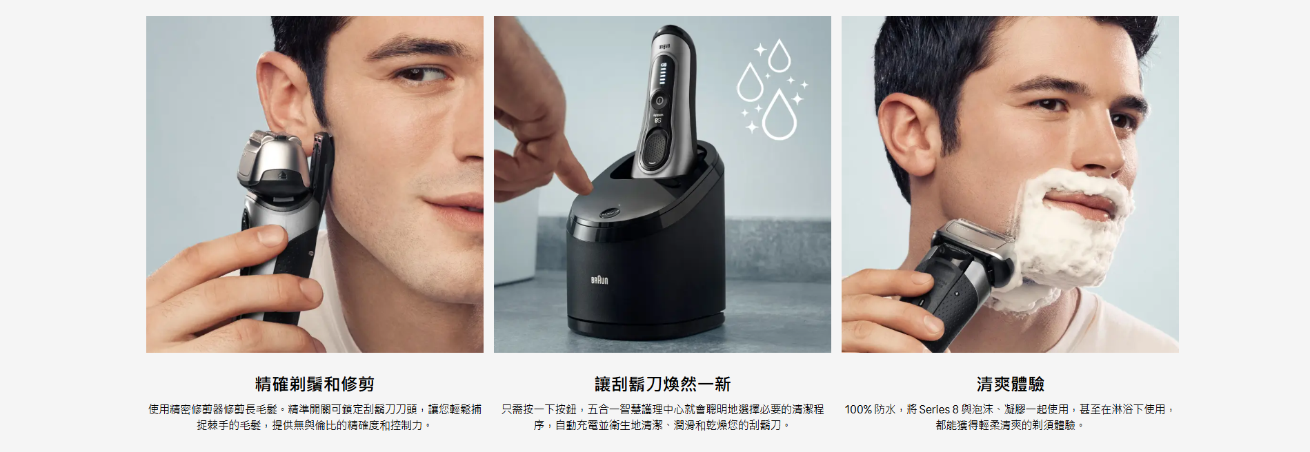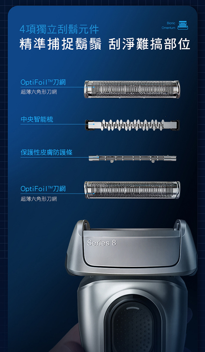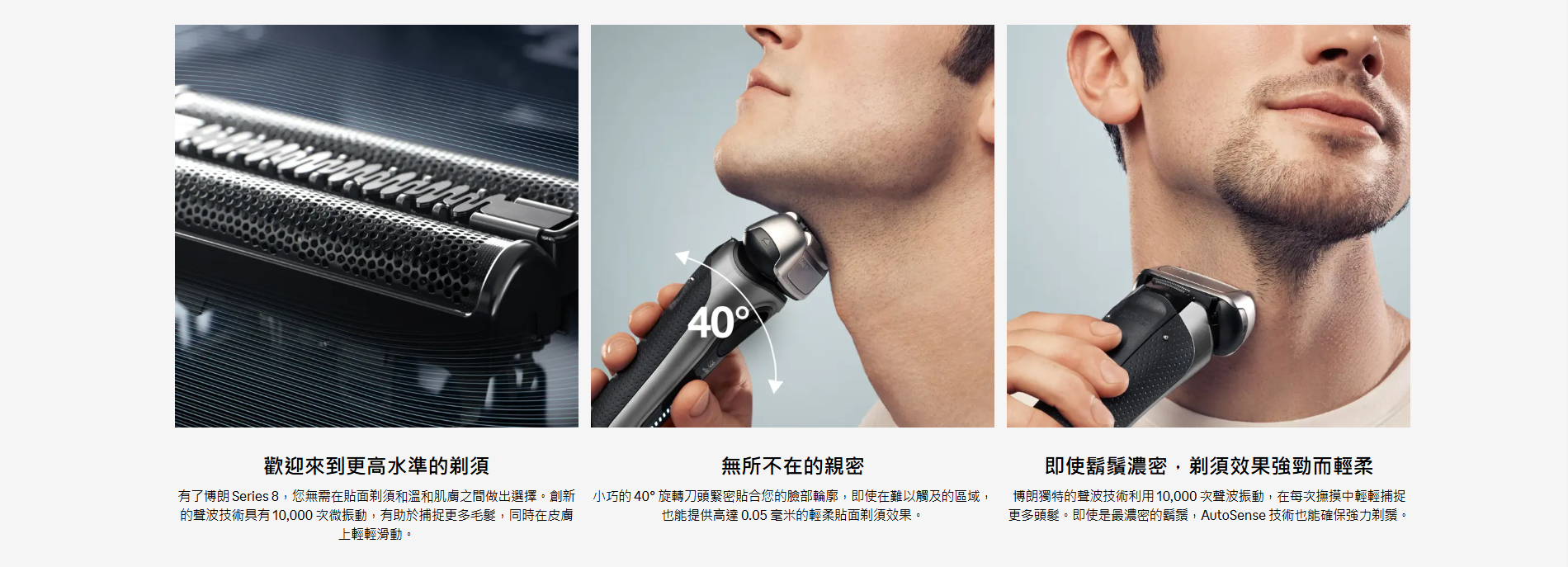 Braun Series 8 男士電動剃須刀提供卓越鬍鬚護理和刮鬍體驗。40度旋轉頭、Sonic 技術和AutoSense 功能確保舒適刮鬍體驗。內置的ProTrimmer修剪器和強大鋰離子電池提供精準修剪和長久使用。100%防水設計,德國製造品質保證。