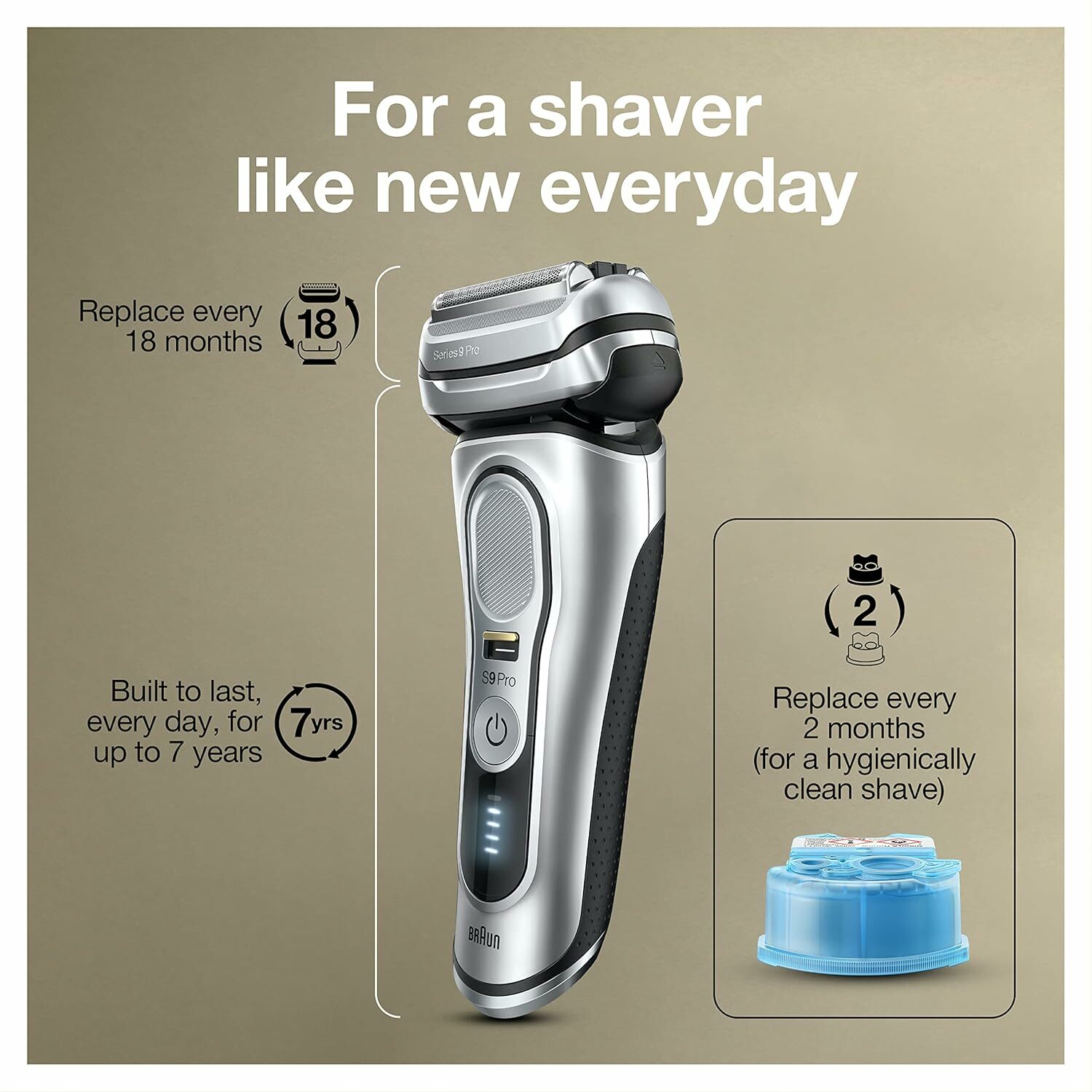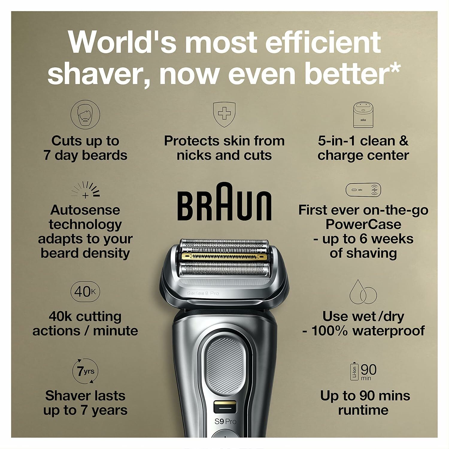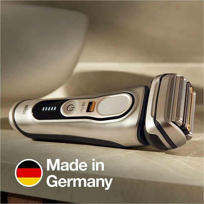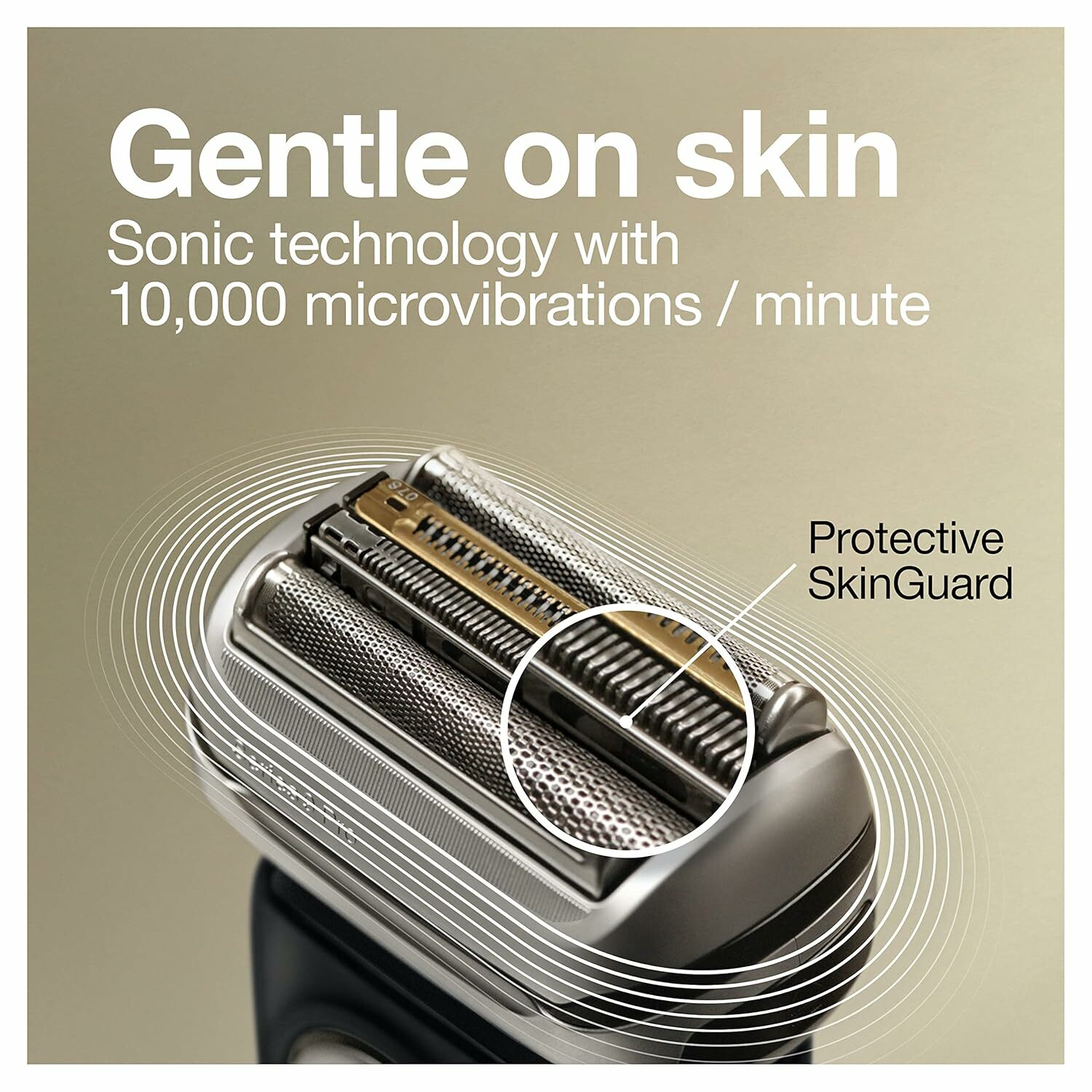 Braun Series 9 全球首創SyncroSonic™聲波科技。 超溫和高效剃淨體驗。SyncroSonic™ 聲波科技,每分鐘交叉修剪40,000 次。五個專門的剃鬚元件,輔以聲波科技,Braun 的專利 SyncroSonic™ 聲波科技能感應鬍鬚並作出相應調節。