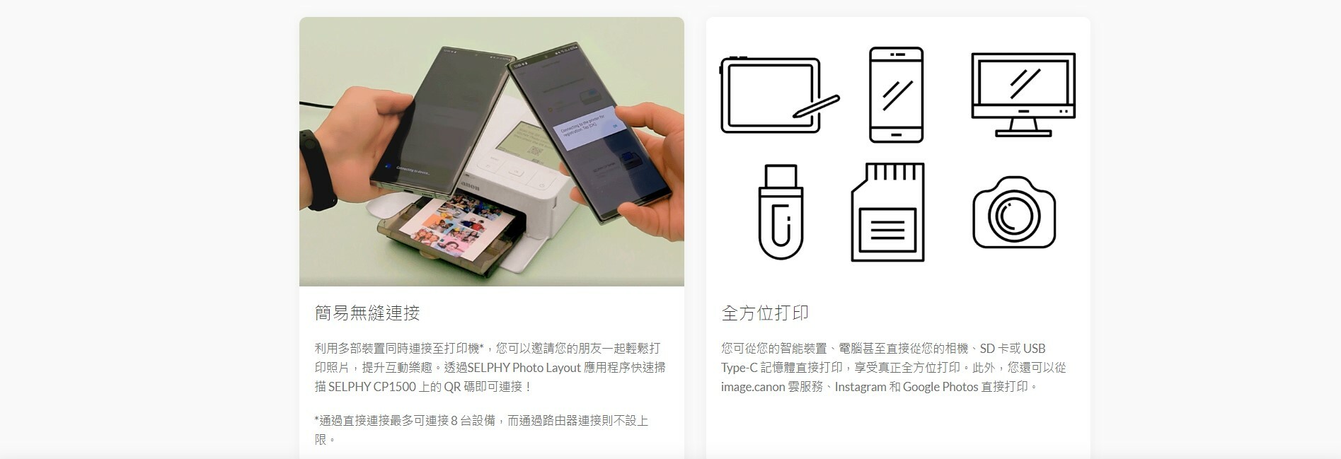 您可從您的智能裝置、電腦甚至直接從您的相機、SD 卡或 USB Type-C 記憶體直接打印,享受真正全方位打印。此外,您還可以從 image.canon 雲服務、Instagram 和 Google Photos 直接打印。