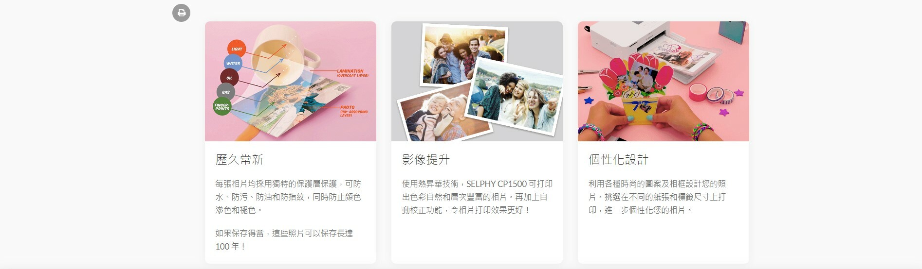 - 印刷品保存期 保存100年。 每張相片上都有一層保護膜,有效防止指模、油、塵埃及水點等外來物,讓珍貴時刻可以長久保存。