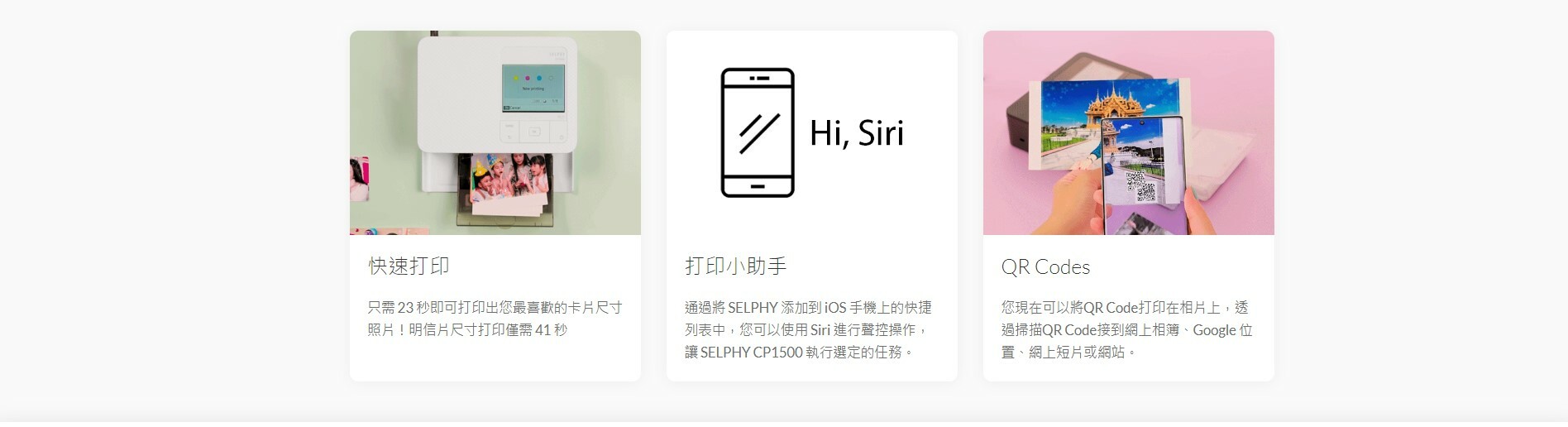 通過將 SELPHY 添加到 iOS 手機上的快捷列表中,您可以使用 Siri 進行聲控操作,讓 SELPHY CP1500 執行選定的任務。