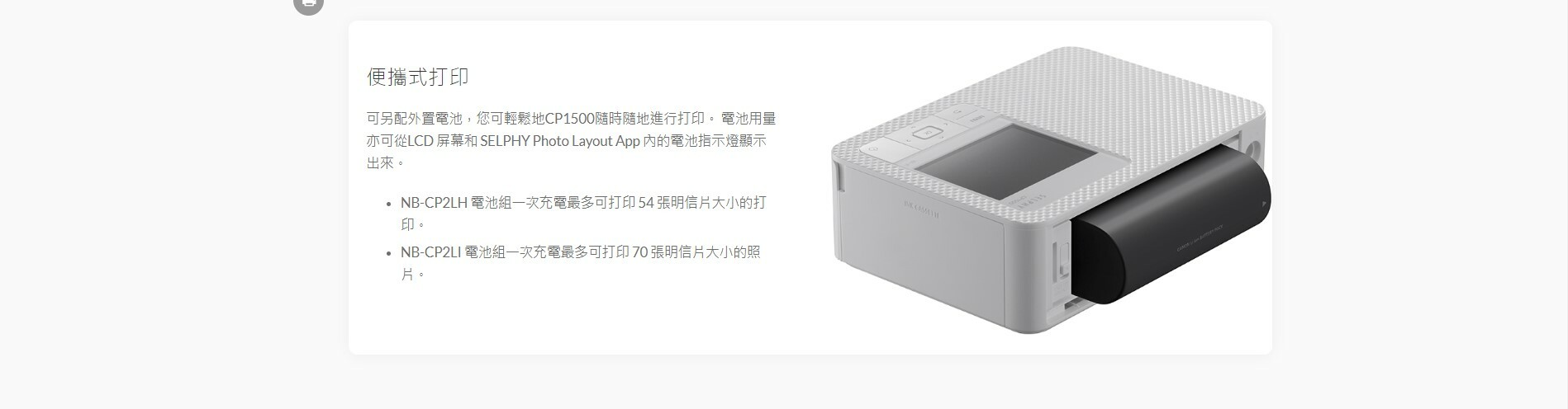 可另配外置電池,您可輕鬆地CP1500隨時隨地進行打印。 電池用量亦可從LCD 屏幕和 SELPHY Photo Layout App 內的電池指示燈顯示出來。
