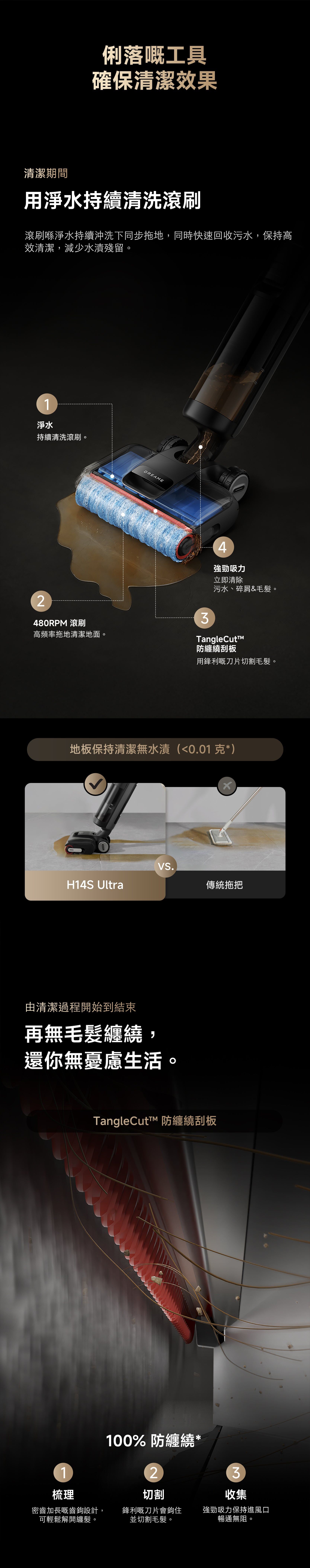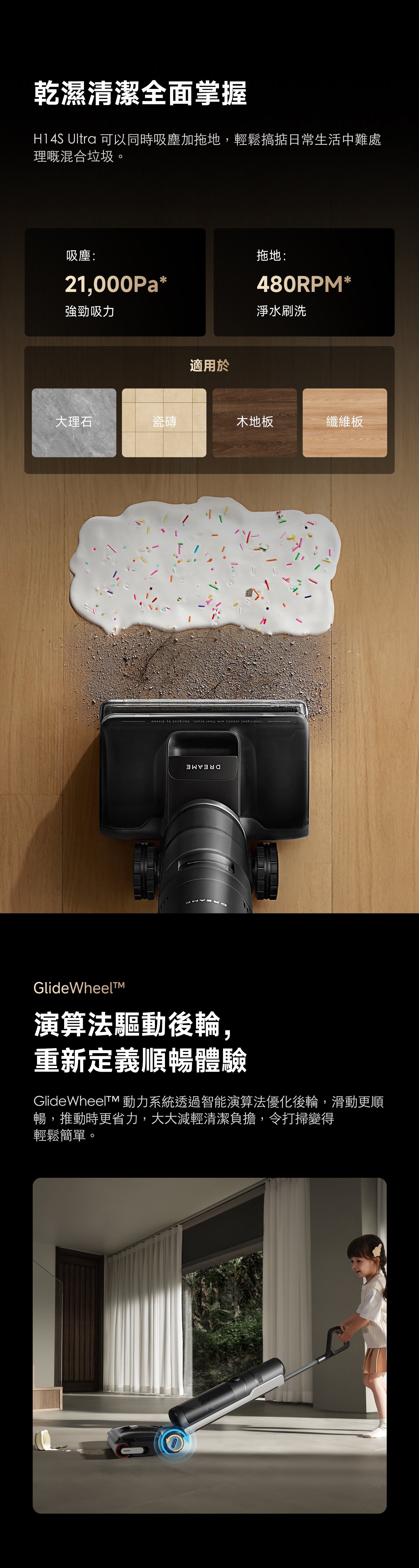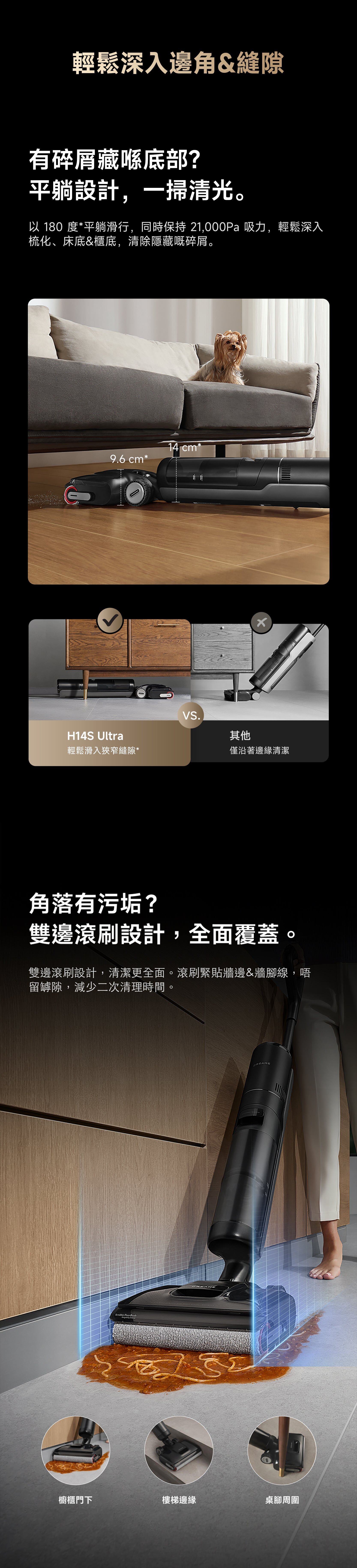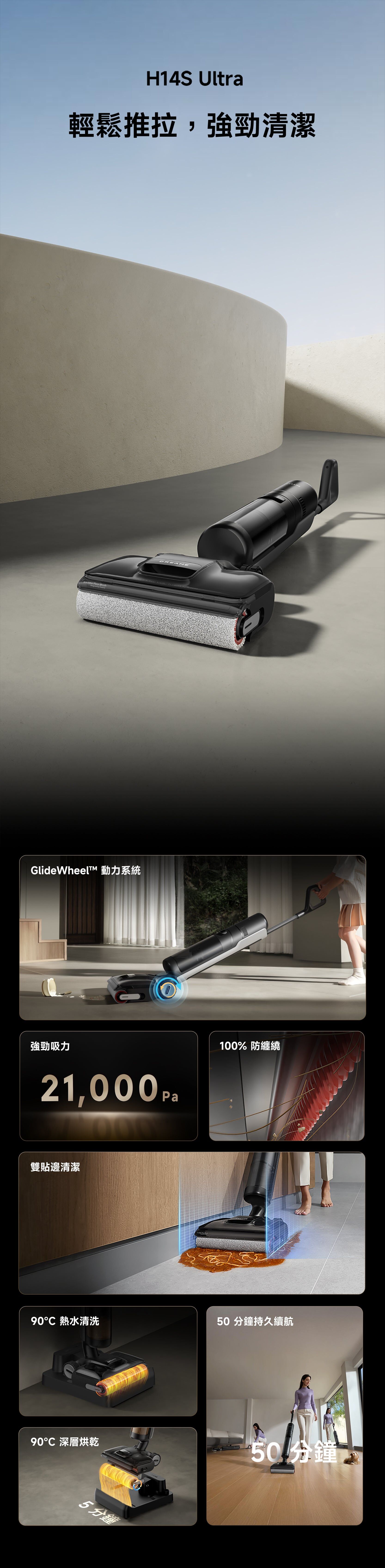 H14S 超強乾濕兩用無線吸塵器,21,000 Pa 吸力,除臭棒,防纏繞刮刀,熱水清洗/自動清潔