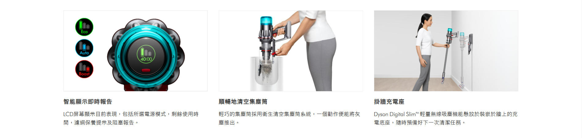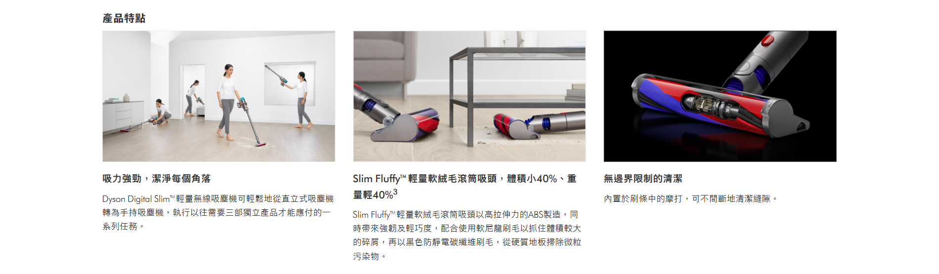 Dyson Digital Slim™ 輕量無線吸塵機,輕巧便攜卻擁有強大的吸力,讓您輕鬆潔淨家居每個角落,清潔效果無與倫比!