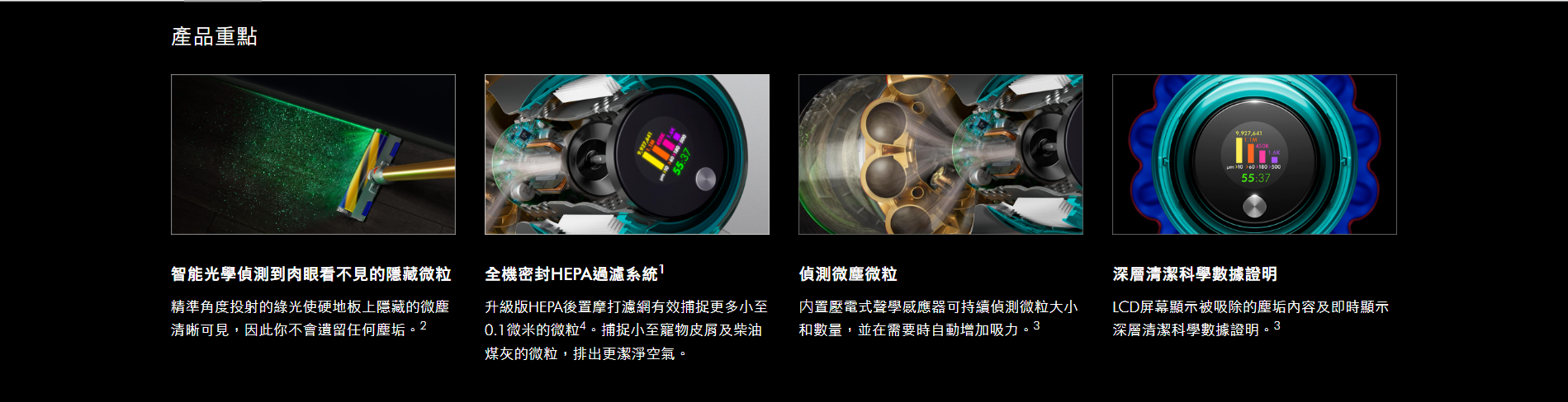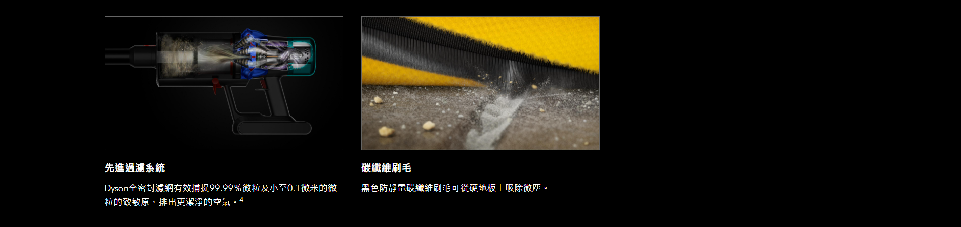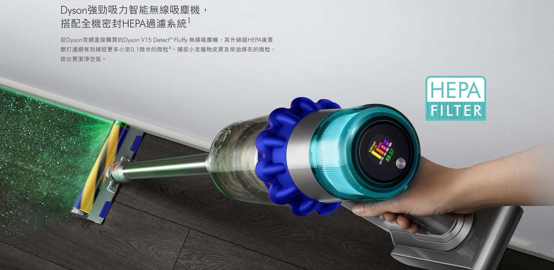 Dyson強勁吸力智能無線吸塵機,搭配全機密封HEPA過濾系統1。