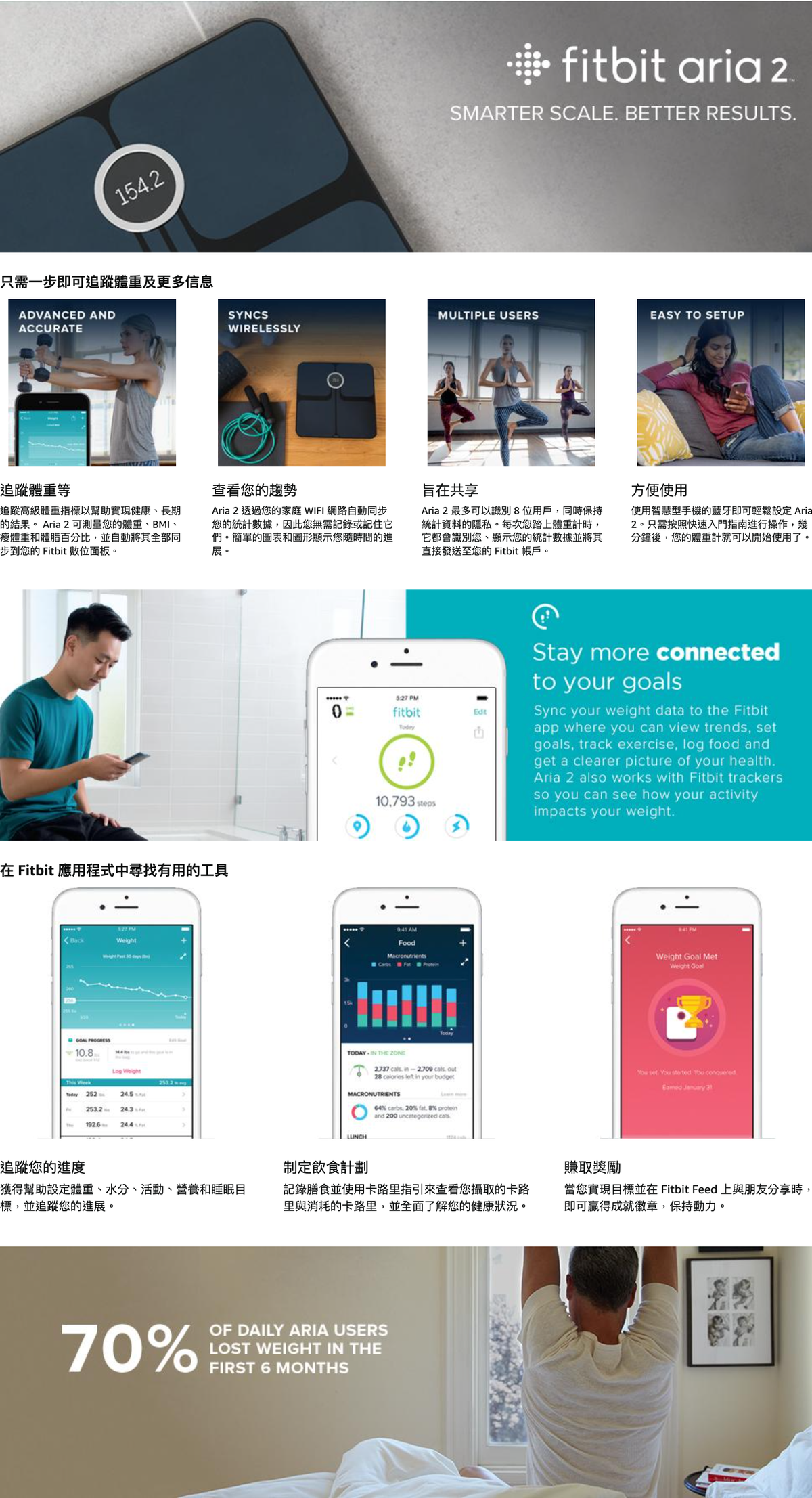 Fitbit Aria 2 智能電子磅,追蹤體重、BMI、廋體質量和體脂率。可識別8名使用者,並保護個人隱私。圖表顯示進度趨勢,與Fitbit追蹤器和應用程式協作,家庭Wi-Fi自動同步統計資料,幫助您達成健康目標。