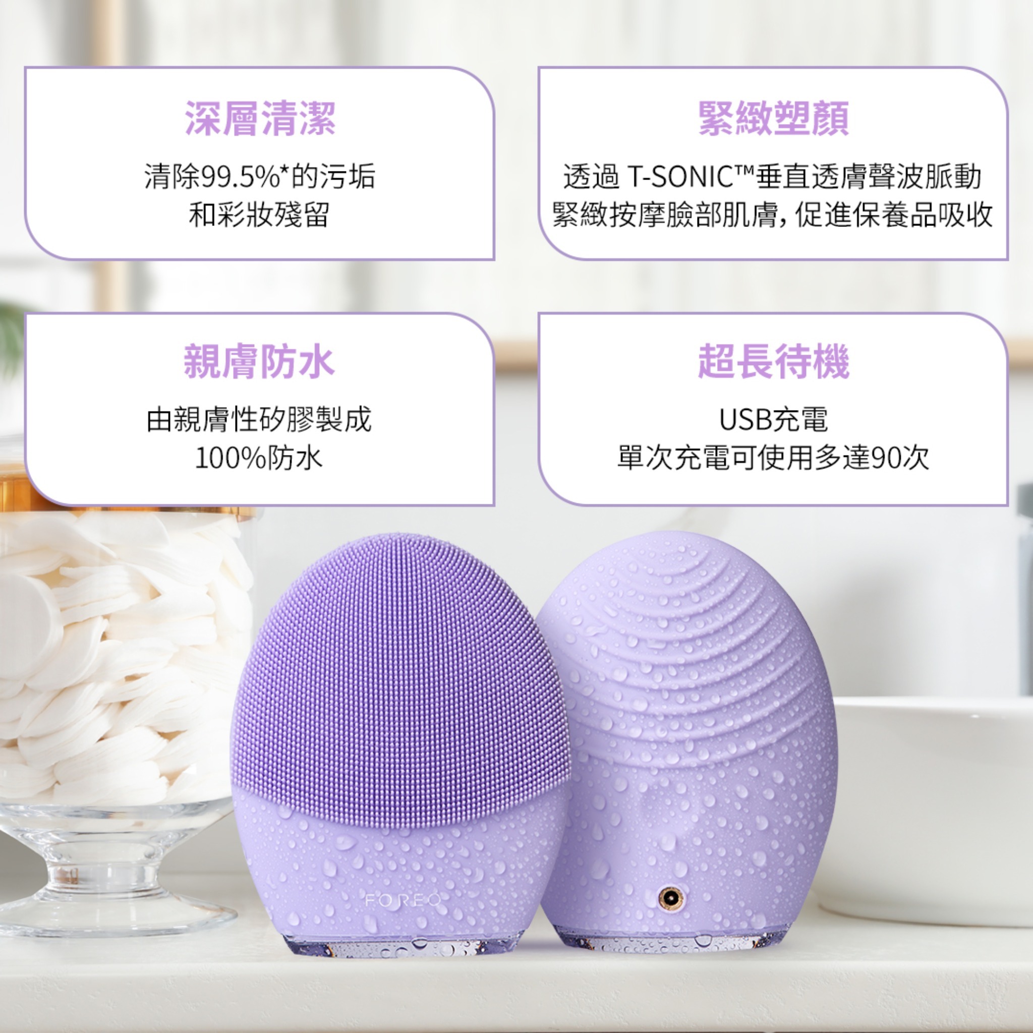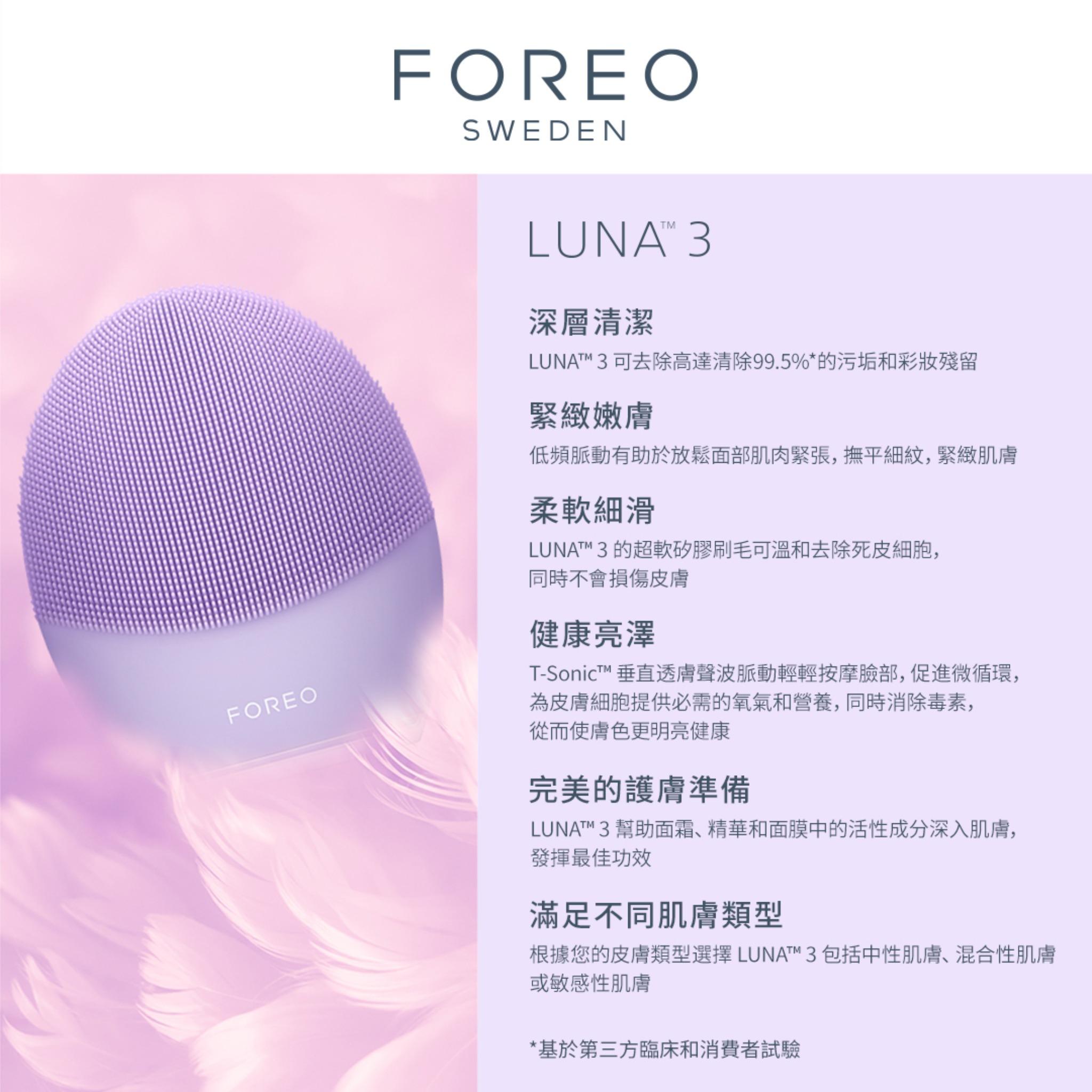 Foreo Luna 3 面部清潔與緊緻按摩器是一款多功能產品,可以幫助淨膚、V面緊緻,以及進行提拉緊緻面膜按摩。它採用了T-SONIC 垂直聲波脈動技術,配備特別柔軟的觸點,並使用超衛生矽膠製成。這款產品擁有智能瑞典設計,提供給使用者高品質的護膚體驗。