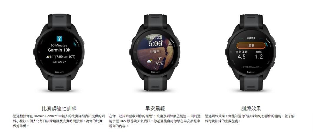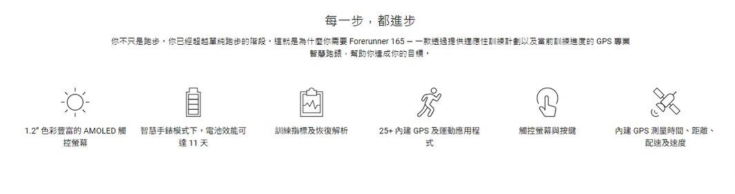Forerunner 165 GPS智慧心率進階跑錶每一步,都進步,你不只是跑步。你已經超越單純跑步的階段。這就是為什麼你需要 Forerunner 165 — 一款透過提供適應性訓練計劃以及當前訓練進度的 GPS 專業智慧跑錶,幫助你達成你的目標。
