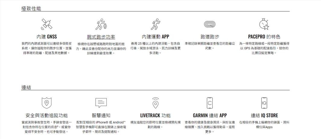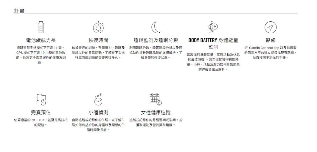 電池效能: 手錶模式最長可達 11 天, 省電智慧手錶模式最長可達 20 天, 僅限 GPS 的 GNSS 模式最長可達 19 小時, 連結所有衛星系統最長可達 17 小時