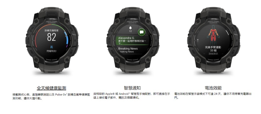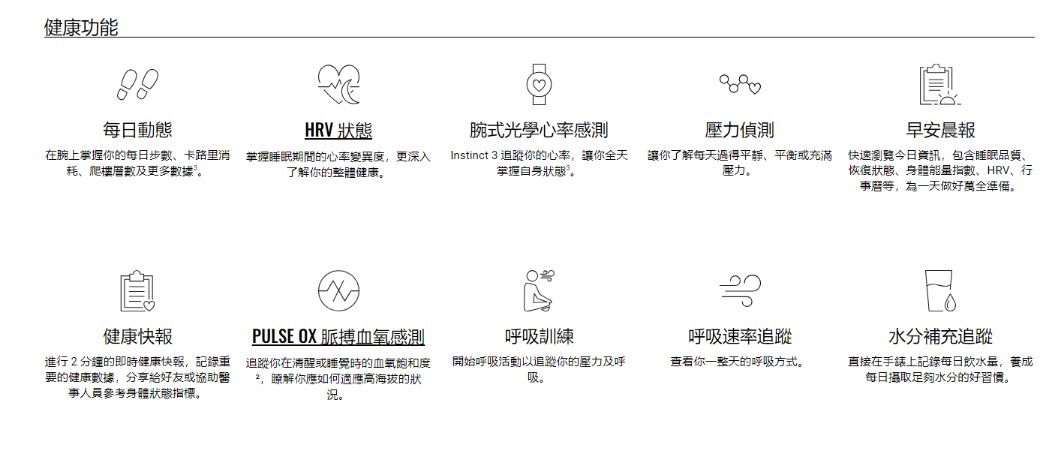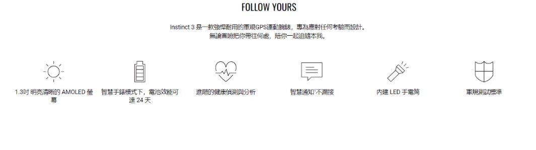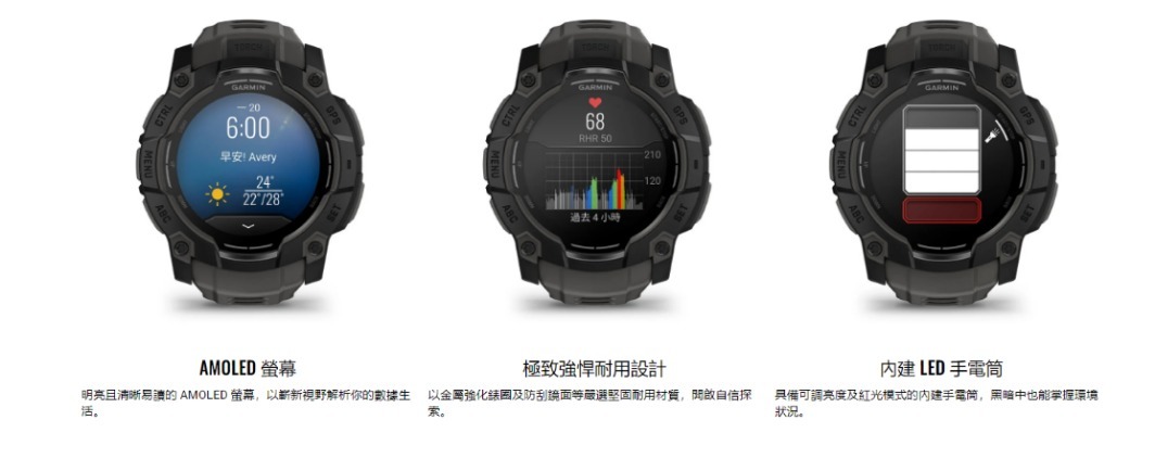 Instinct 3 AMOLED 智慧手錶採用軍規標準打造,強化金屬錶圈堅固耐用,更內建 LED 手電筒,炫彩 AMOLED 螢幕,實用功能一次到位。