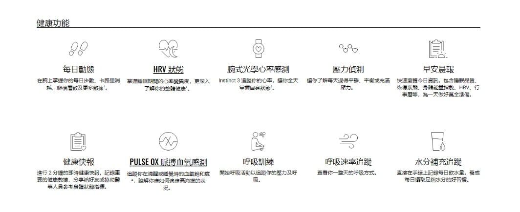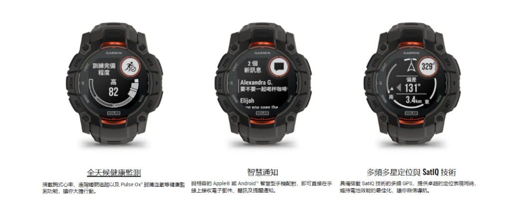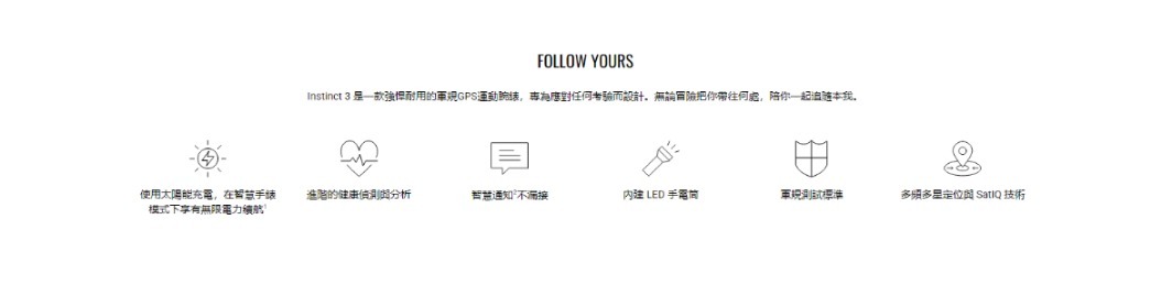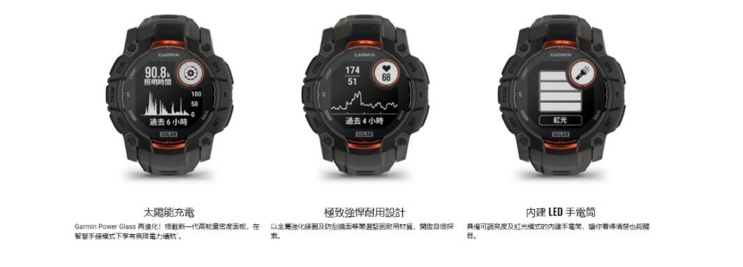 Instinct 3 Sola 智慧手錶採用軍規標準打造,強化金屬錶圈堅固耐用,更內建 LED 手電筒,可彈性選擇太陽能充電,實用功能一次到位。