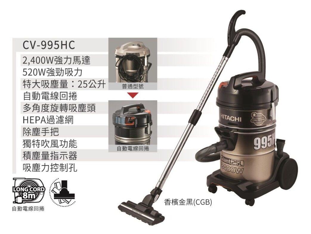 HITACHI 日立 CV-995HC 2400W 商用吸塵機擁有高功率設計,適用於商業環境,提供快速而有效的清潔解決方案。