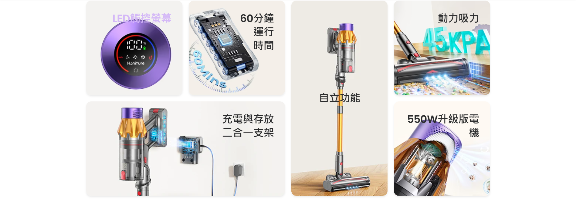 Honiture X7 無線吸塵機是一款輕便實用有45KPa 強大吸力 & 最新550W 馬達和高達 60 分鐘運行時間的無線吸塵機,作為家居清潔利器,讓您輕鬆應對各種清潔工作。無線設計讓您更靈活地清潔家中各個角落。
