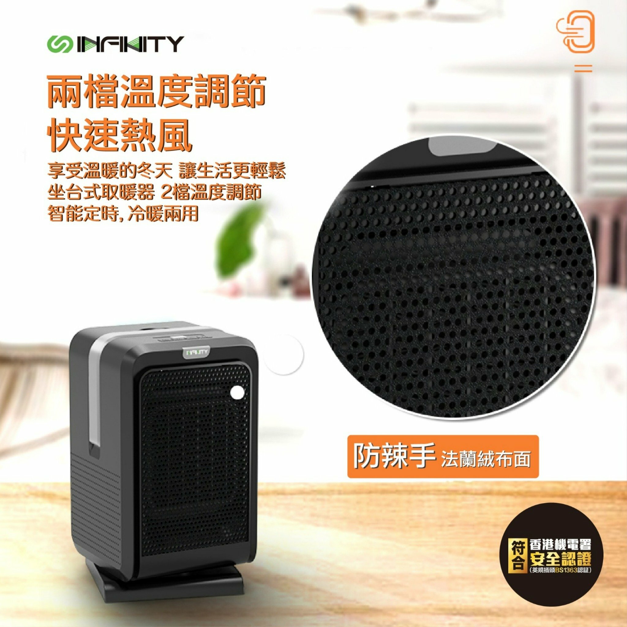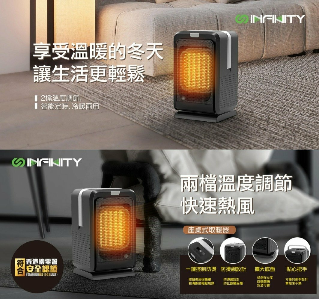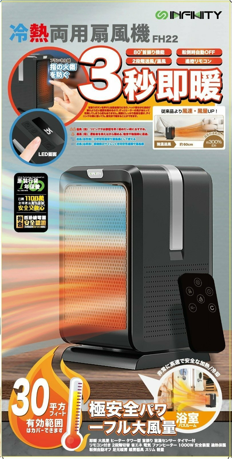 Infinity FH22陶瓷式加熱冷暖風機具備四種運行模式(高熱/低熱/涼風/省電),適合浴室、家庭或公司使用。設計有塔式PTC無明火發熱單元,一至三秒即熱,並配有遙控器。80度搖頭、翻倒自動斷電及過熱保護裝置確保安全。