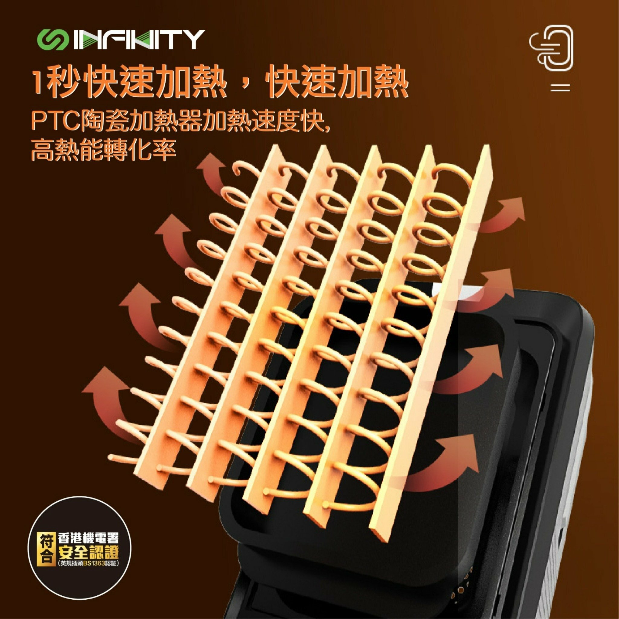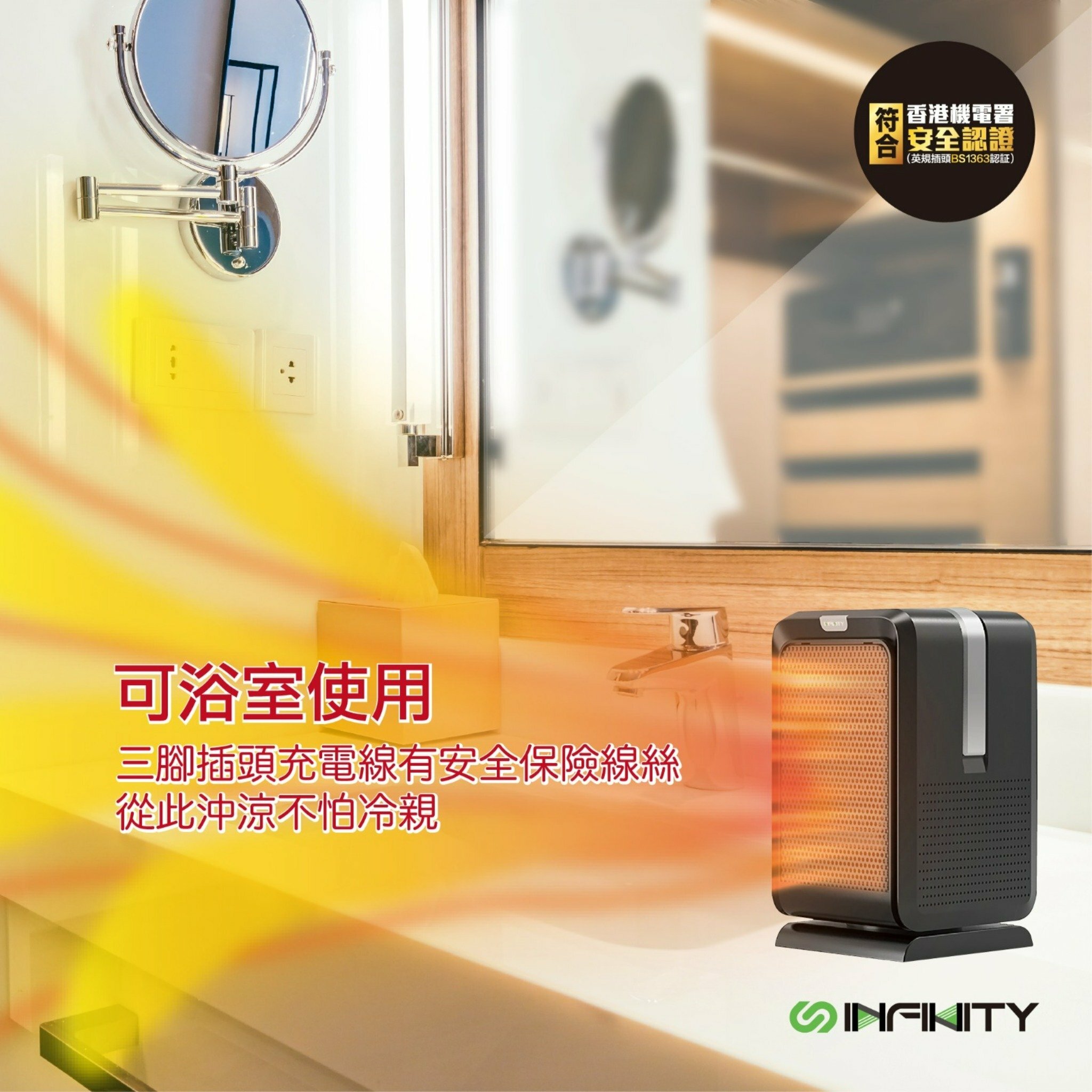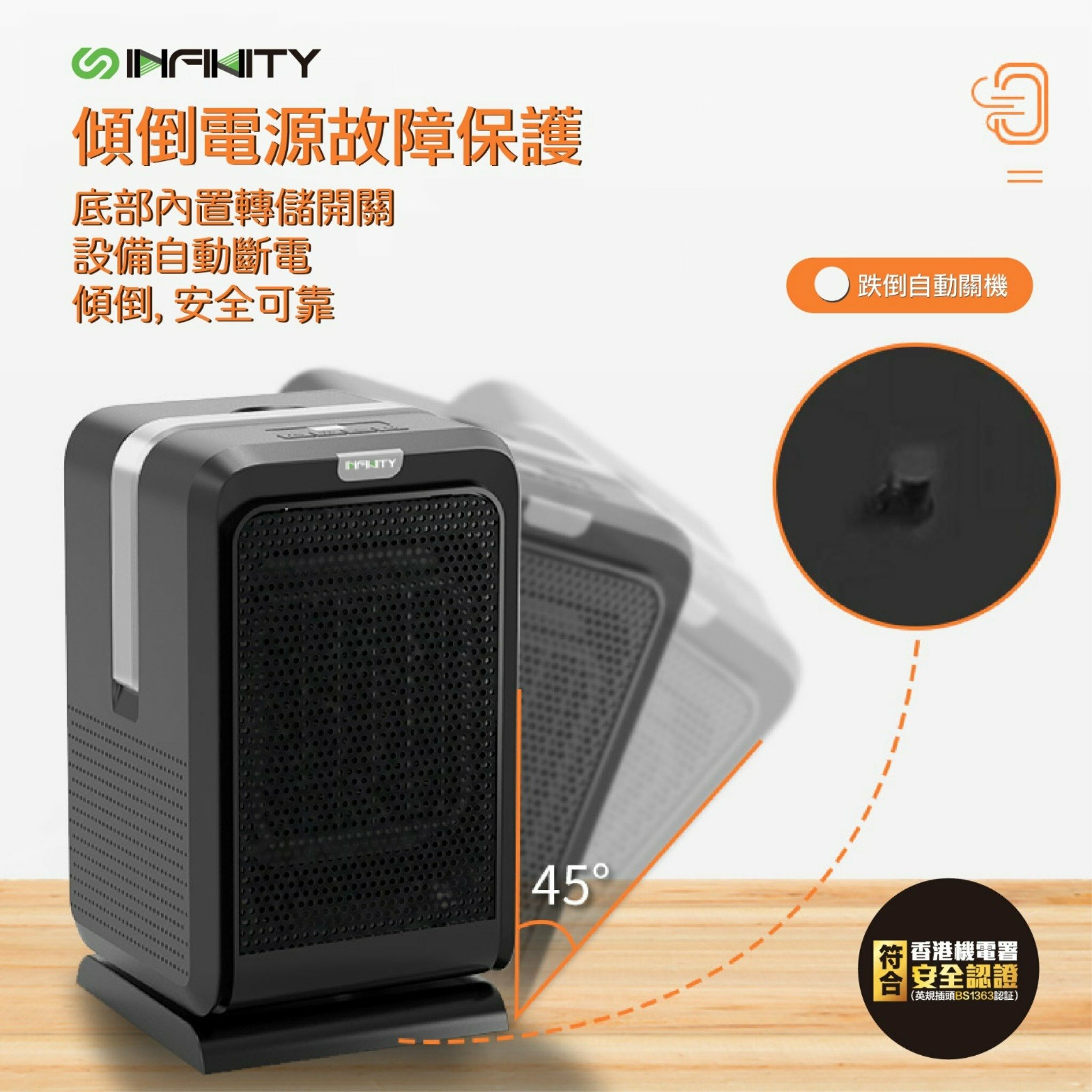 Infinity FH22陶瓷式加熱冷暖風機具備四種運行模式(高熱/低熱/涼風/省電),適合浴室、家庭或公司使用。設計有塔式PTC無明火發熱單元,一至三秒即熱,並配有遙控器。80度搖頭、翻倒自動斷電及過熱保護裝置確保安全。