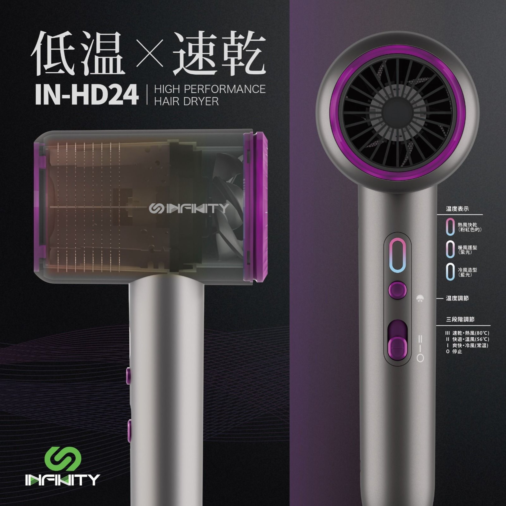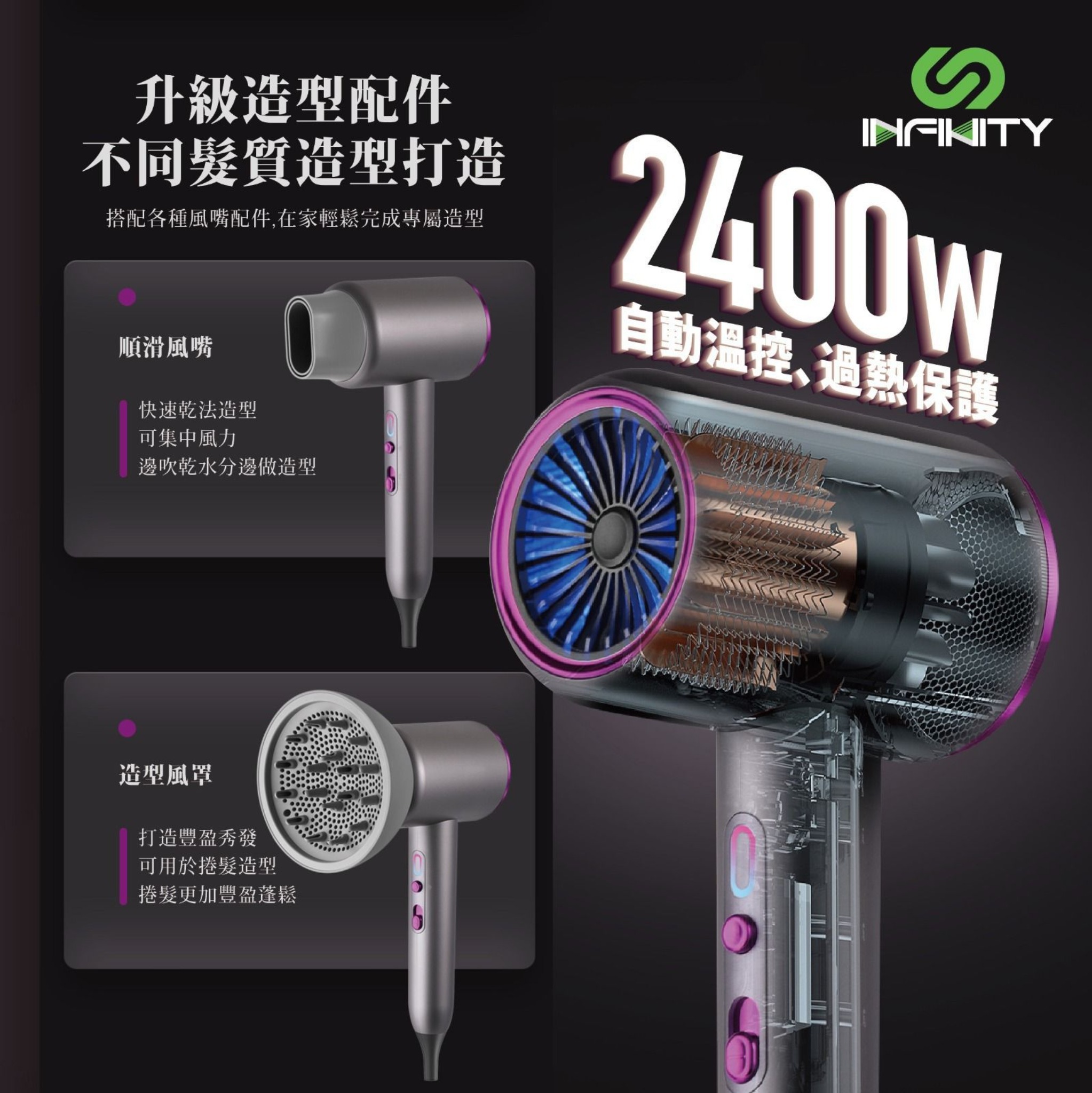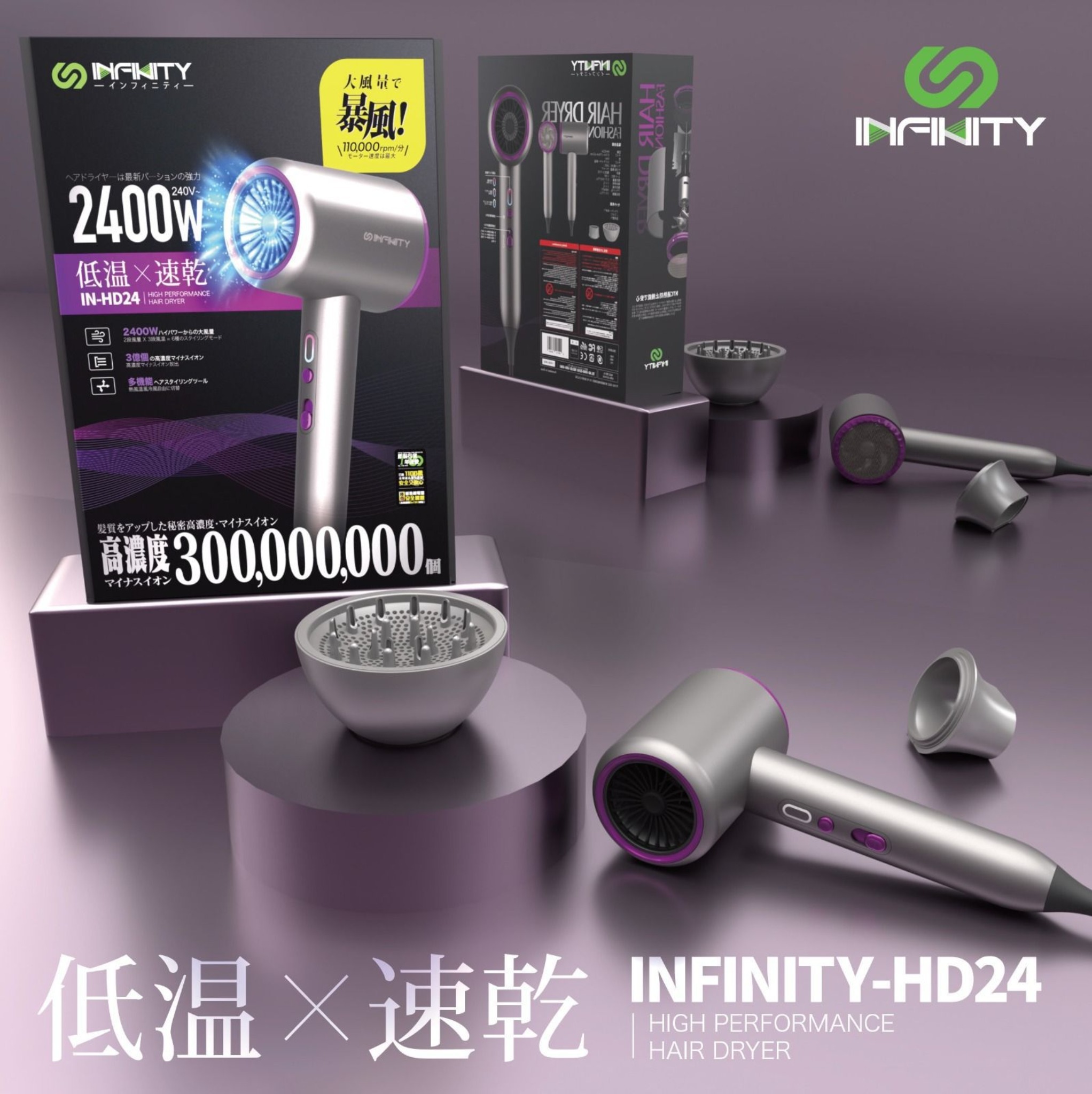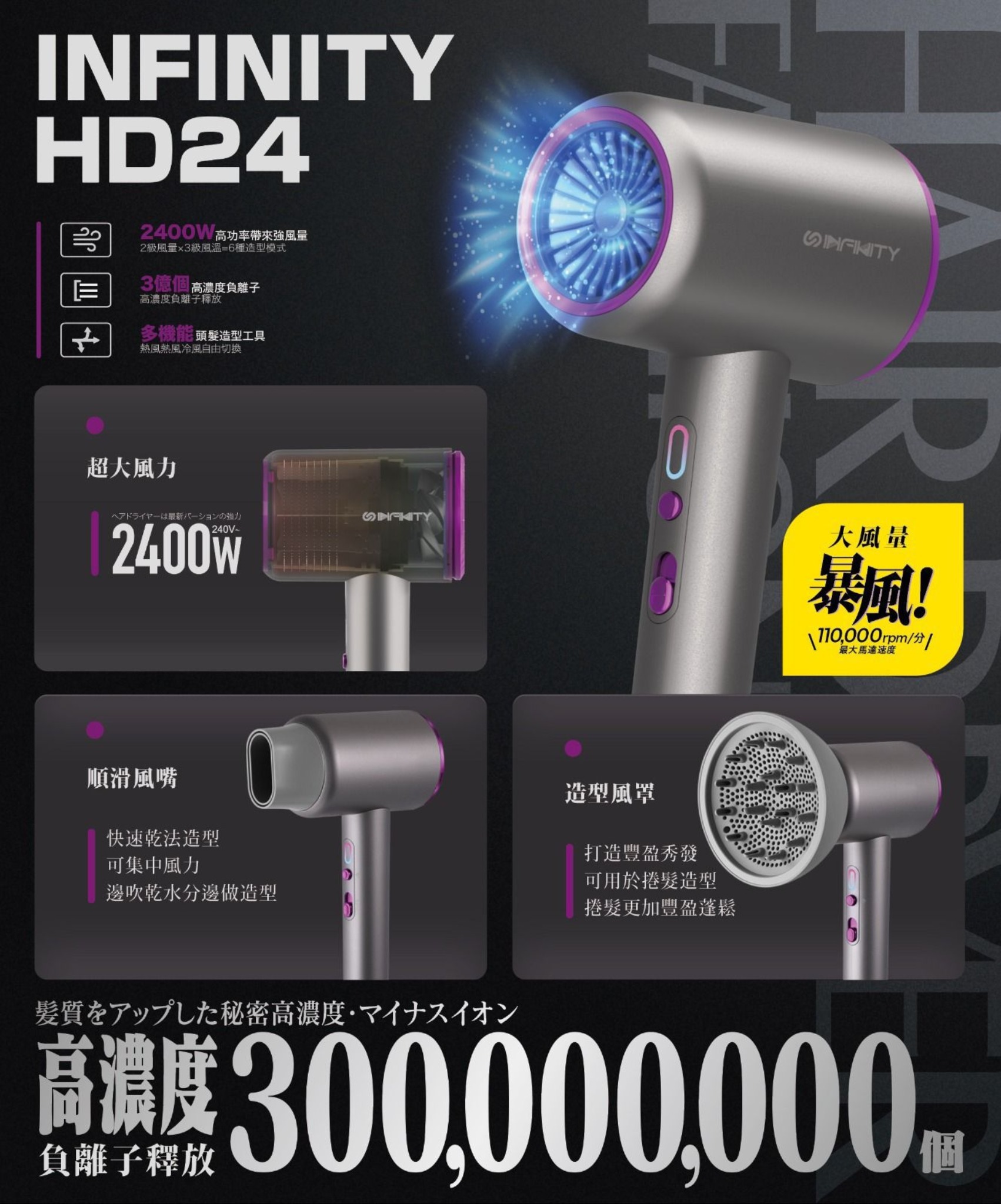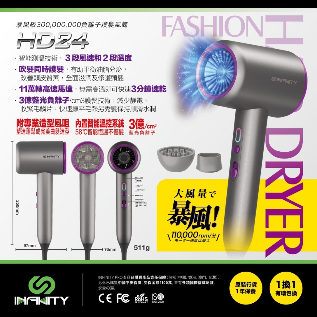 Infinity HD24暴風級3億負離子護髮風筒擁有2400W高功率,3段風量和2段風溫設計。3億藍光負離子技術減少靜電,護髮同時平衡油脂分泌。內置智能溫控系統,附專業造型風咀,讓秀髮保持順滑水潤。輕便易用,