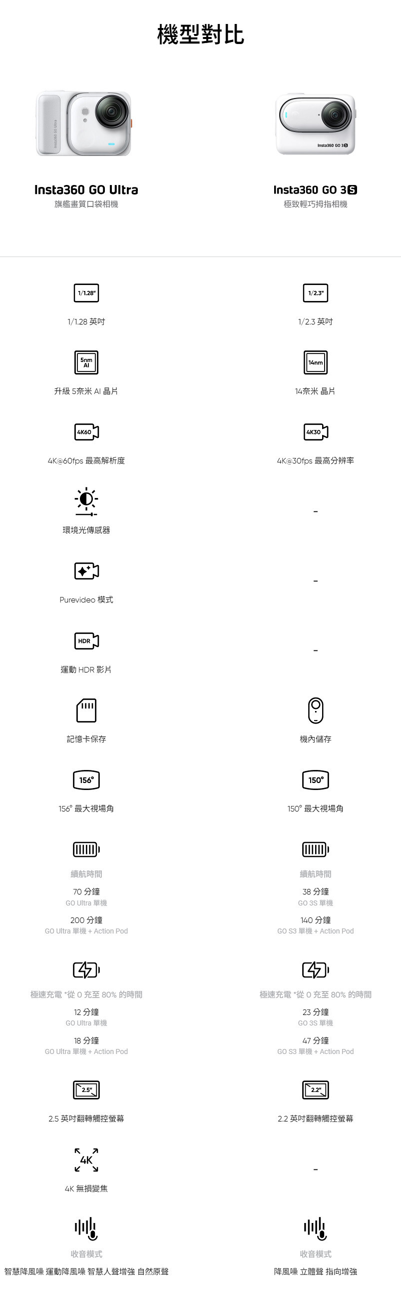 Insta360 Go Ultra 旨在讓您輕鬆捕捉下一次冒險,擁有更有效率的影片、照片和音訊捕捉功能,同時保持高品質的影像。增強的純視訊模式、2.5 吋翻轉觸控螢幕、四種音訊捕捉模式以及更長的電池續航時間是 GO Ultra 的部分擴展功能。憑藉升級的 1/1.28 吋影像感應器,GO Ultra 可拍攝高達 4K60 解析度的影片和 50MP 解析度的照片。此創作者套裝版本包含自拍棒、旋轉支架、快拆式底座、磁吸式吊墜、磁吸式簡易夾以及快速拆式安全繩,讓您安心安裝。