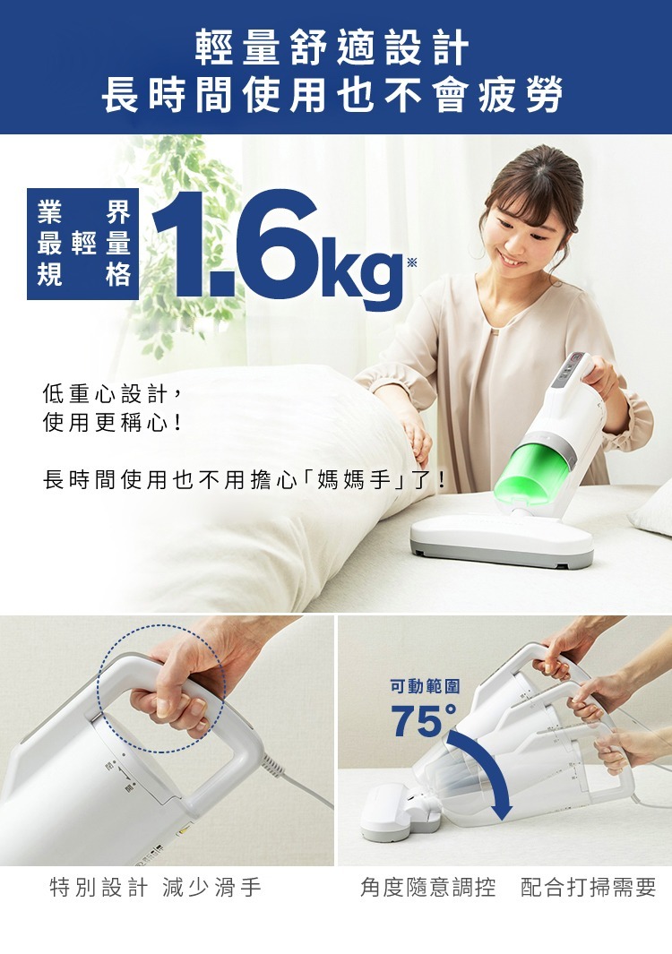 IRIS OHYAMA FAC11超輕量除塵蟎吸塵機,重量只有1.6 KG,使用三色燈高敏感度的塵蟎感應器顯然除塵蟎情況,每分鐘拍打約7000次與暖風功能來降低室內濕度,降低塵蟎生成 ,雙重過濾及可水洗式設計及使用一之性集塵袋將拍打出的蟎蟲和有害健康的致敏原清除。