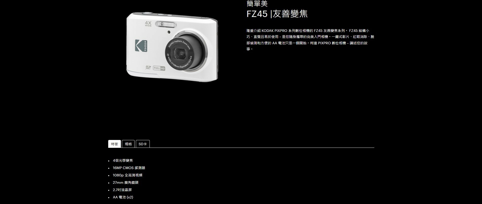 Kodak 柯達 PIXPRO FZ45 數碼相機 黑色,結構小巧、直覺且易於使用,具有一鍵式影片、紅眼消除、臉部偵測和方便的 AA 電池。是隨身攜帶的完美入門相機,讓您輕鬆講述您的故事。