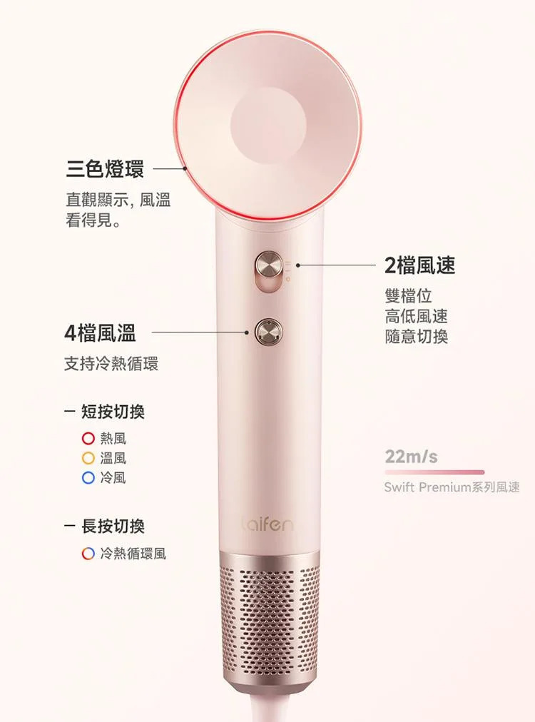 Laifen Swift Premium - 極致體驗,尊貴的設計散發著優雅精緻的氣息。 採用強大的無刷摩打和負離子技術,比傳統風筒更快地吹乾頭髮,讓頭髮閃亮、不捲曲。 耳語般的聲音水平確保寧靜地打造個性造型。 使用 Laifen Swift Premium 提升您的髮質,體驗前所未有的奢華享受。