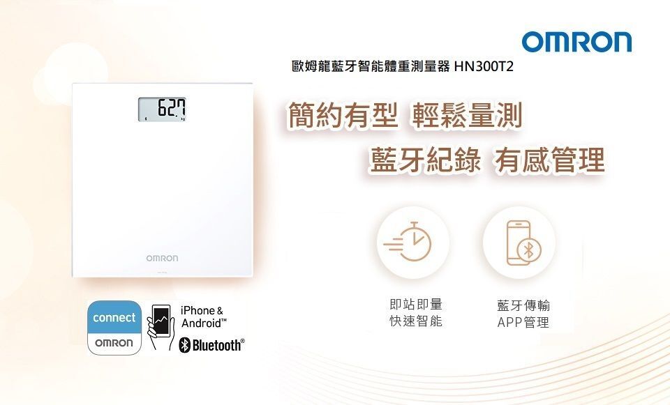 歐姆龍 Omron HN-300T2 歐姆龍藍牙智能體重計 智能藍牙傳輸APP記綠管理 一踩即量 快速量測 體重測量 BMI監測 (APP內顯示) 小巧輕薄易收納 不佔空間