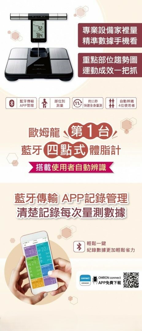 Omron KRD-703T藍芽體重體脂磅提供精確的體重和體脂資訊,讓您輕鬆管理健康。藍芽連接功能方便您隨時追蹤健康狀況。