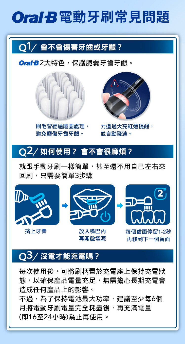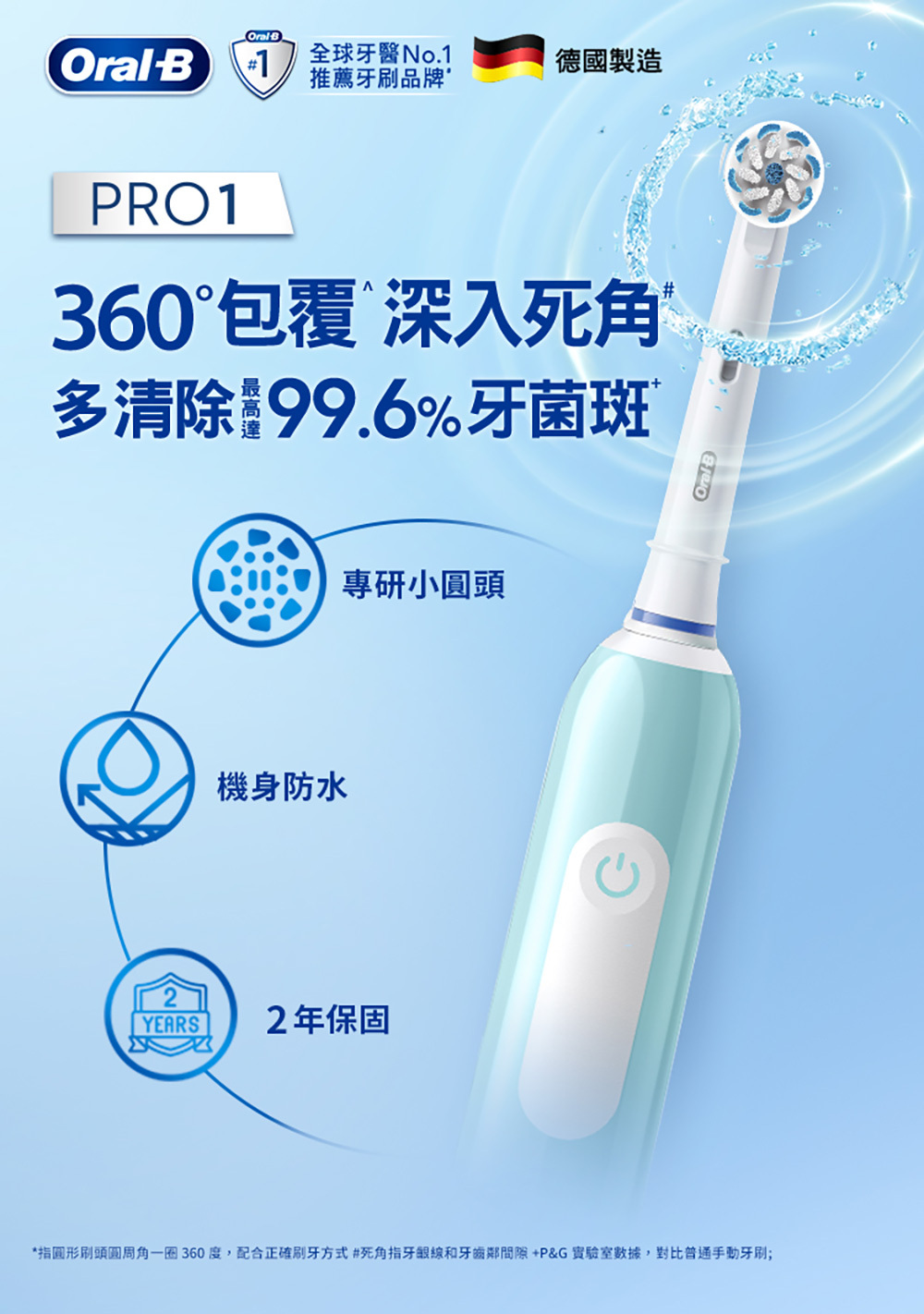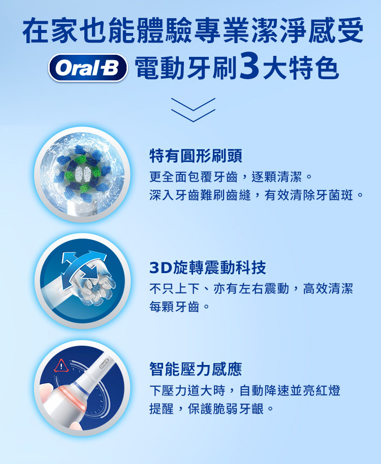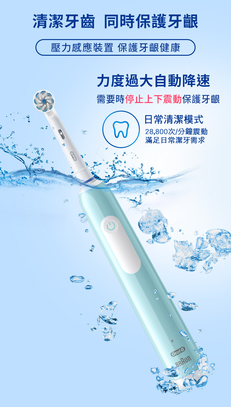 Oral-B Pro 1 電動牙刷採用先進的科技,提供有效而溫和的牙齒清潔。其特點包括高效震動清潔系統、專利圓形刷頭設計、可調節壓力感應技術和長效電池等功能。透過每分鐘多達 40,000 次的震動,能深入清潔牙齒縫隙和牙釉質表面,有效去除牙菌斑。Oral-B Pro 1 電動牙刷還配備了壓力感應技術,可避免過度用力刷牙,保護牙齒和牙齦。長效電池設計讓您無需經常充電,使用更加方便。