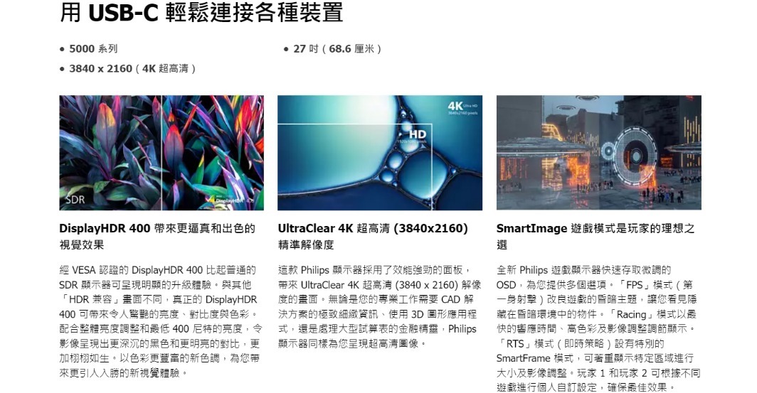 訊號輸入:HDMI 2.0 x 1,DisplayPort 1.2 x 1,USB-C x 1(DP Alt 模式,可供電高達 65 瓦),USB3.2 x 2(配備 1 個快速充電)