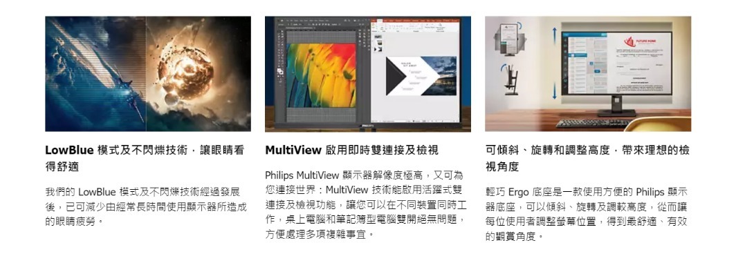 LowBlue 模式及不閃爍技術,讓眼睛看得舒適