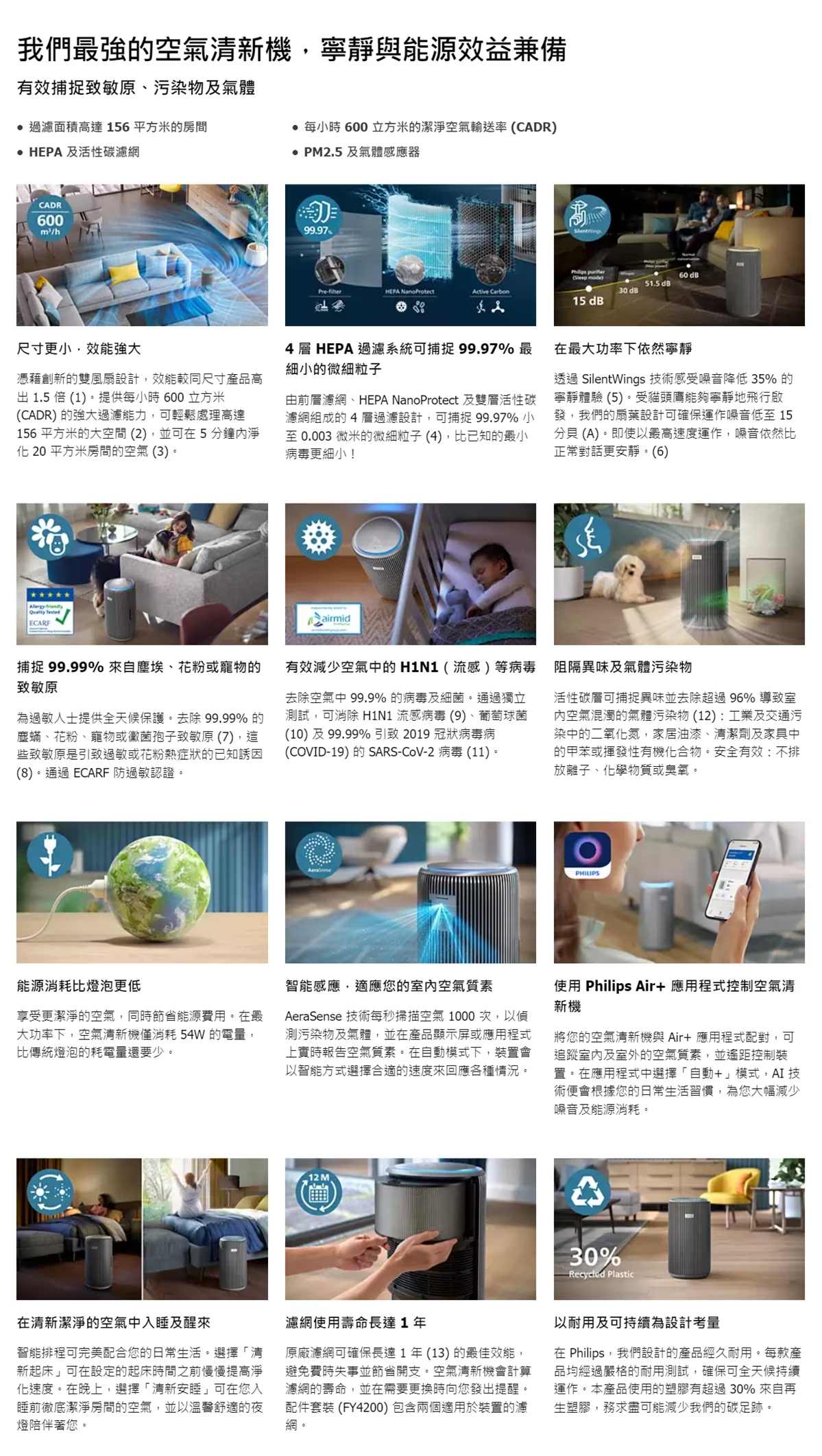 憑藉創新的雙風扇設計,效能較同尺寸產品高出 1.5 倍 (1)。提供每小時 600 立方米 (CADR) 的強大過濾能力,可輕鬆處理高達 156 平方米的大空間 (2),並可在 5 分鐘內淨化 20 平方米房間的空氣 (3)