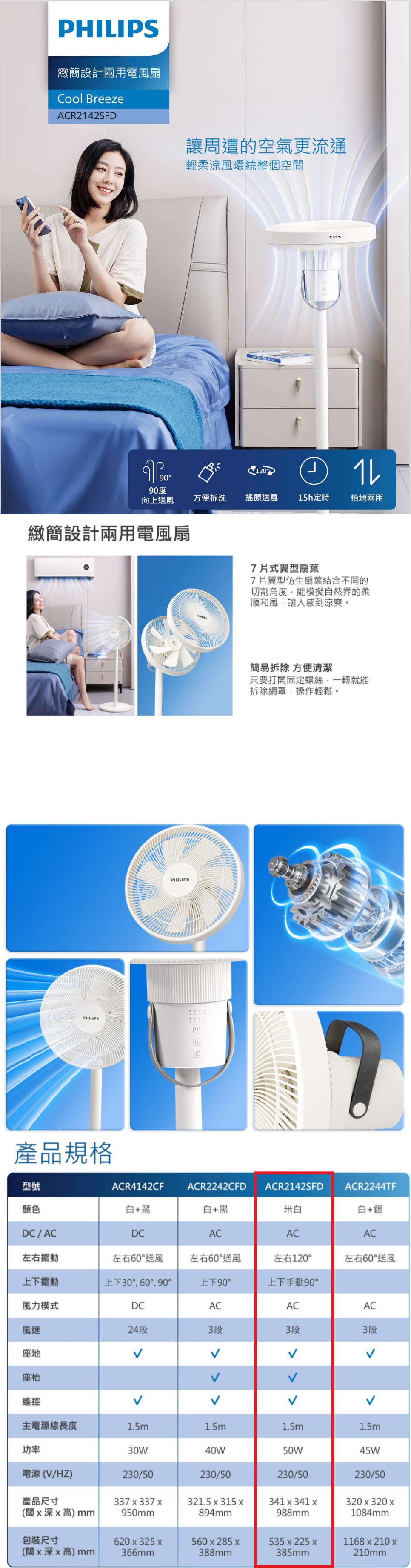 Philips 飛利浦 ACR2142SFD 緻簡設計兩用電風扇使四周空氣更流通。7 葉翼型仿生扇葉、自然柔風、聲音更輕,拆裝簡單、平台兩用,兩種控制模式、操作方便,噪音低、無干擾。