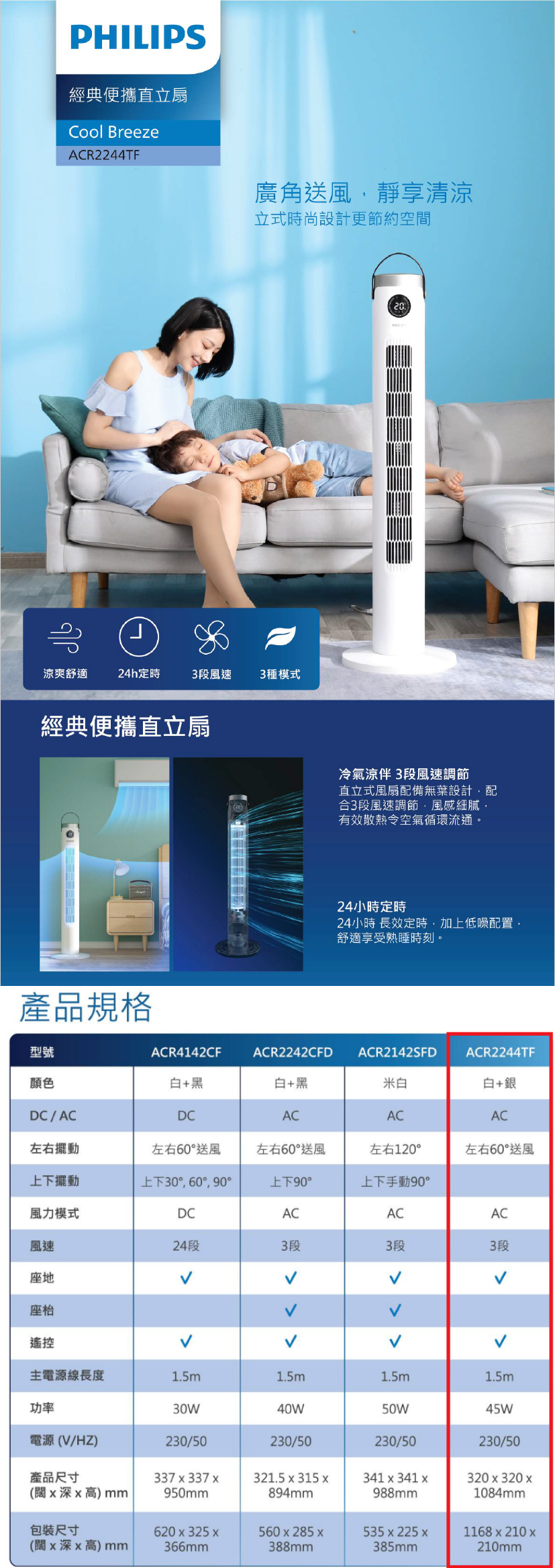 飛利浦 Philips ACR2244TF 經典便攜直立扇,容易操作,3段風速調節,60度左右送風。