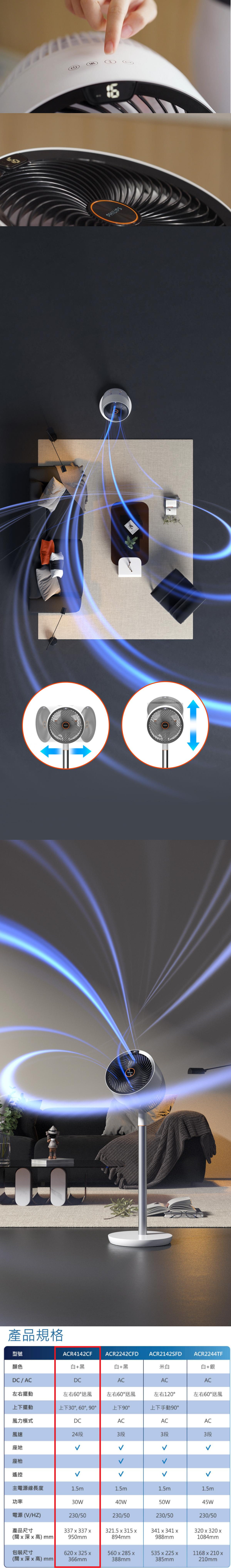 Philips ACR4142CF 3D 負離子 DC 循環電風扇內部設有負離子空氣淨化器,能有效去除異味並淨化室內空氣。它是一款DC直流循環扇,省電寧靜。具有24段風速調節和12小時定時關機功能。上下送風角度可調節為30°、60°、90°,左右送風角度可調節為60°。同時附帶遙控器方便操作。