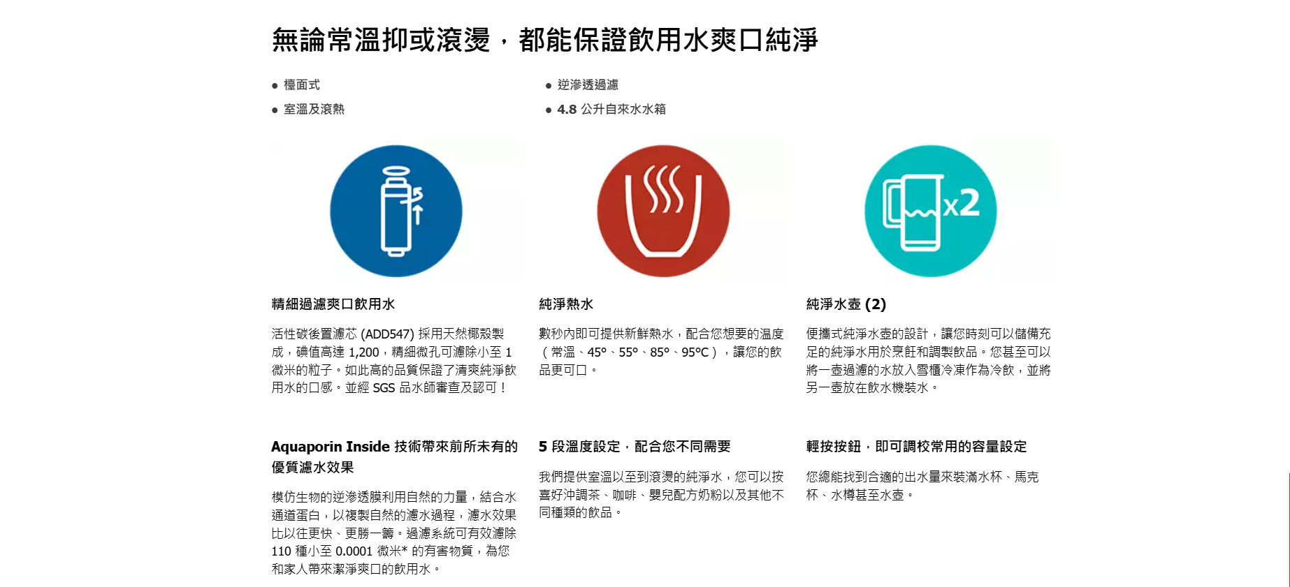 Philips ADD6850 RO 純淨即飲飲水機無論常溫抑或滾燙,都能保證飲用水爽口純淨,這款飲水機最適合追求輕鬆精緻生活的年輕人及小型家庭。除了復古的細緻設計,這款飲水機亦為您帶來由 SGS 絕佳口感測試保證的爽口純淨飲用水!