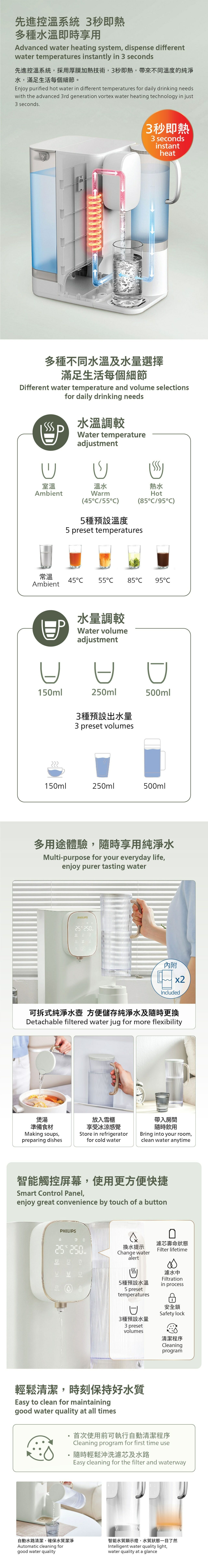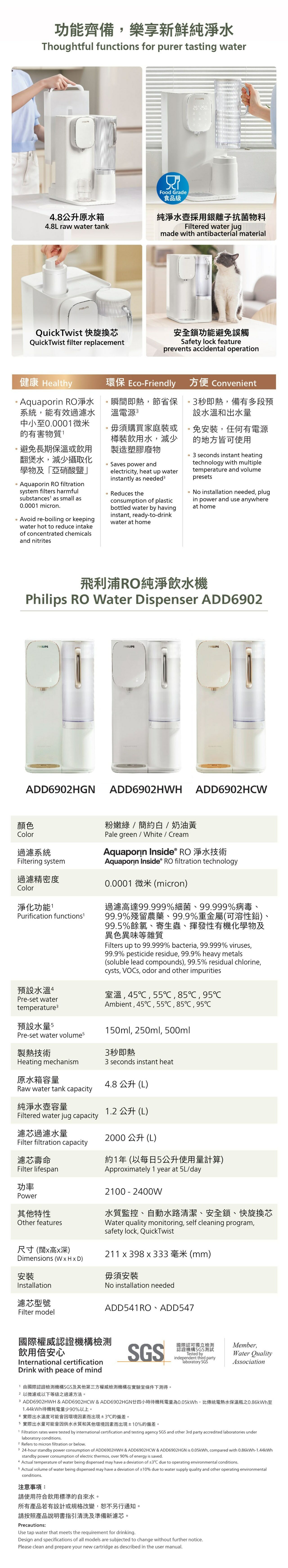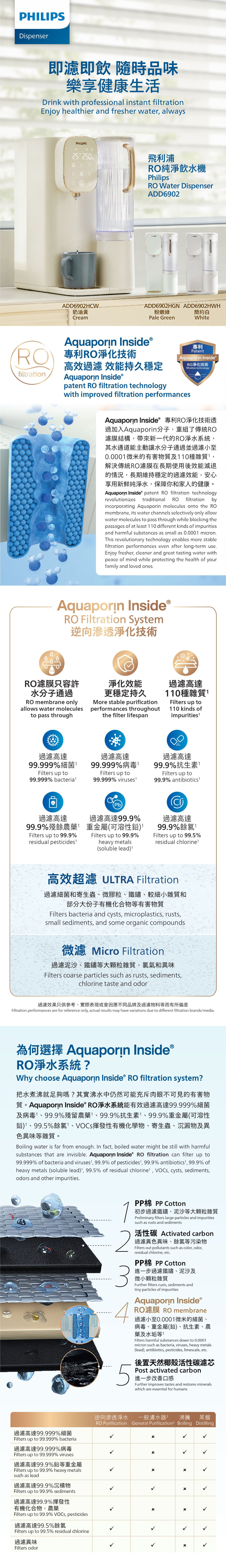 Philips ADD6902 RO 純淨飲水機為您帶來更便捷的飲用體驗。100% 真煲技術,新鮮熱水觸手可及。AquaShield 過濾系統可去除 110* 種有害物質,便攜式水壺滿足不同需求。