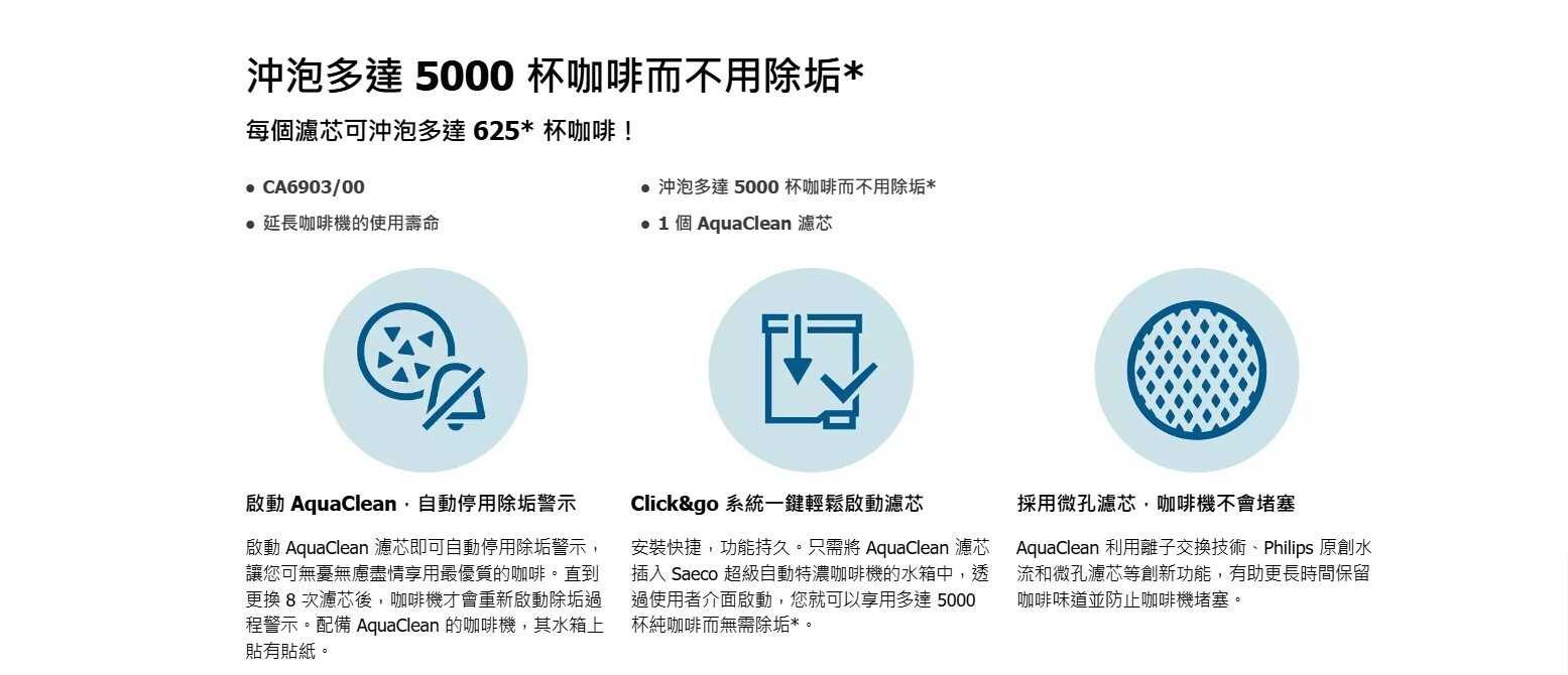 飛利浦 CA6903 咖啡機專用 AquaClean濾水芯為咖啡機提供純淨濾水效果,確保咖啡品質。