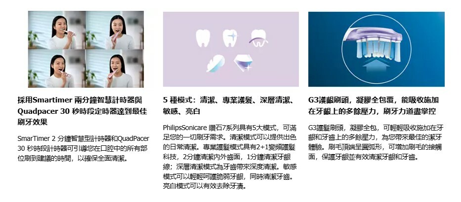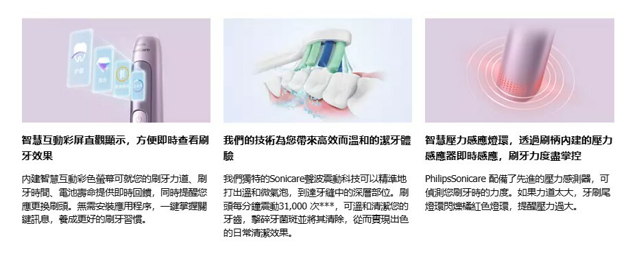 透過內建智慧互動彩屏,展現日常刷牙狀況;與牙醫共研*2+1Gum Pro變頻護齦模式不傷牙齦;內建先進的壓力感測燈,刷牙力度盡掌控;使用G3 護髮刷頭,凝膠全包裹科技,獲得卓越的刷牙體驗