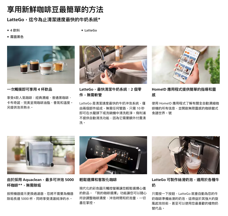 飛利浦 Philips EP2330/31 2300系列 全自動意式咖啡機 霧黑色,一鍵即享 新鮮咖啡純粹 ,LatteGo 是迄今為止清潔最方便快捷的奶泡系統。